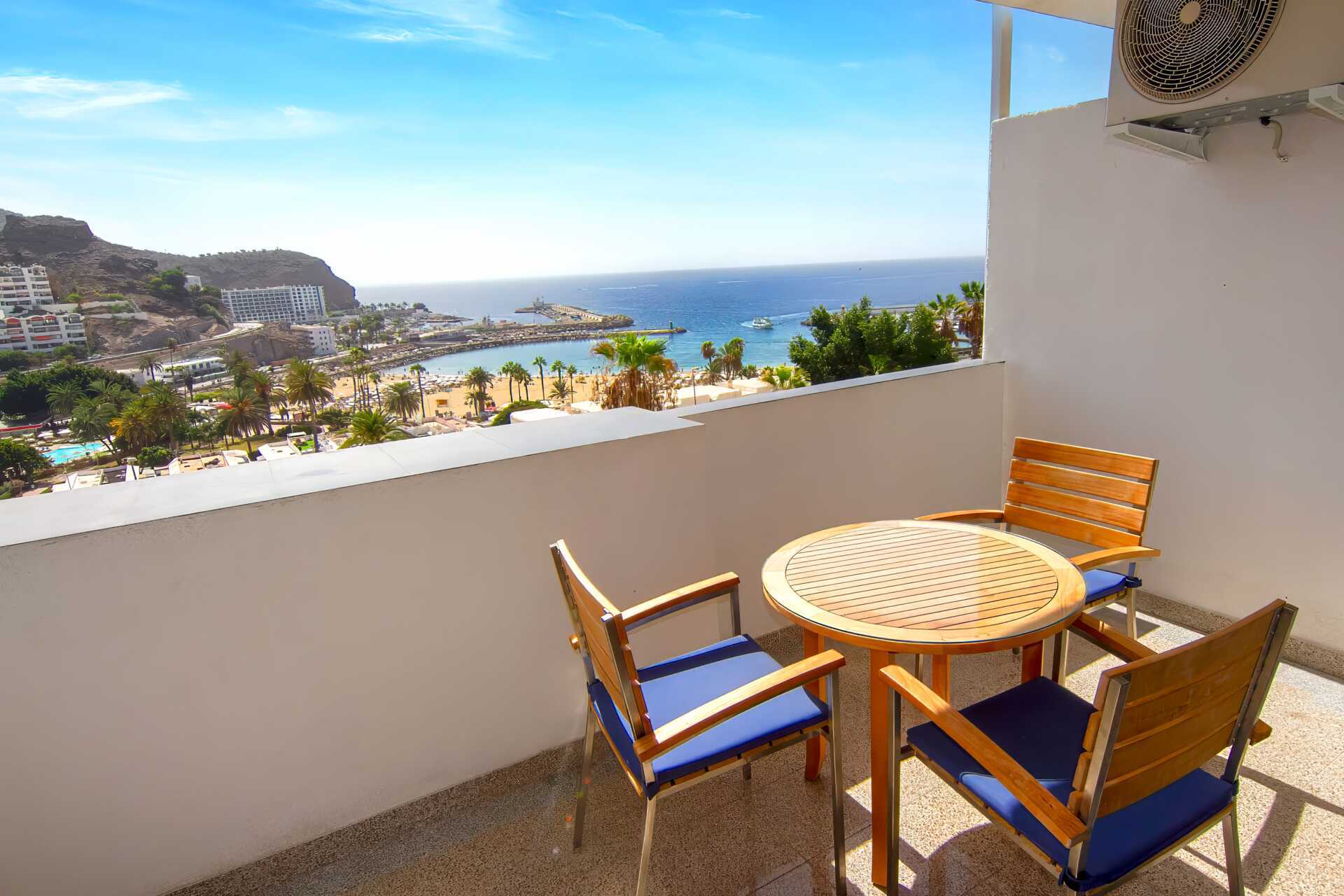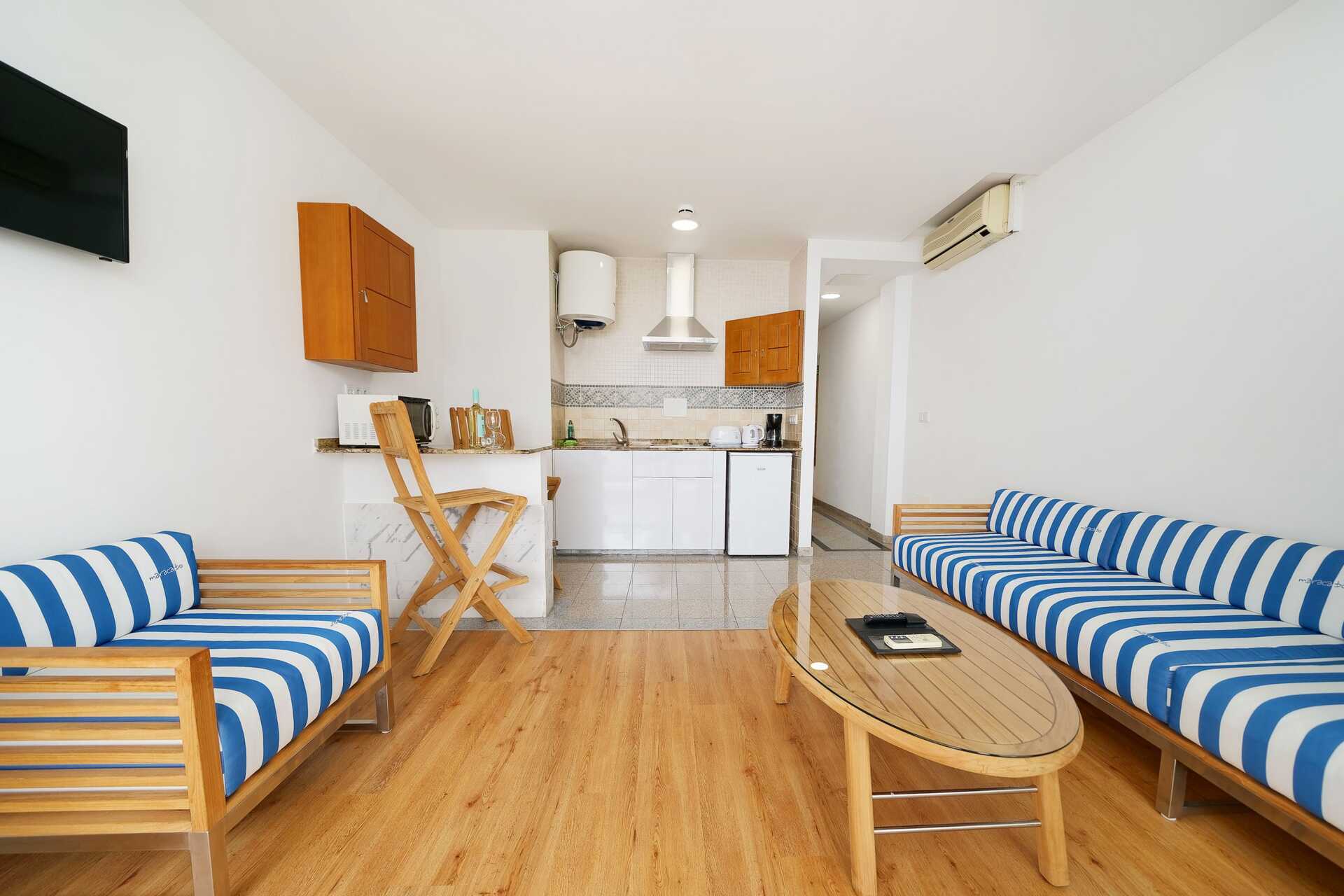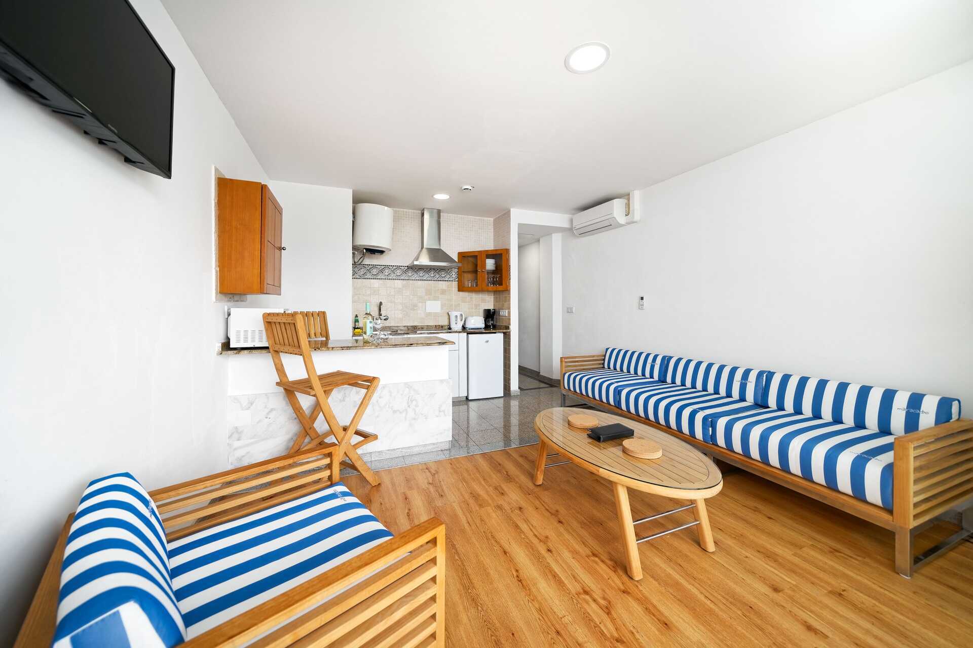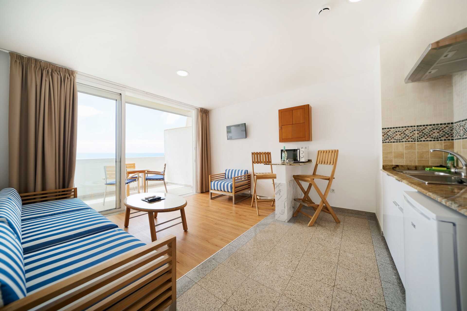 2-værelses lejlighed superior med balkon og havudsigt. Lejlighederne er beliggende på tredje eller fjerde etage. Soveværelse og kombineret opholdsrum/minikøkken. En dobbeltseng eller to enkeltsenge. Mulighed for ekstra opredning i sovesofa. Minikøkken med kogeplader, køleskab, kaffemaskine, el-kedel, brødrister og enkelt køkkenudstyr. Nogle lejligheder har en bardisk som spiseplads. Gratis wifi og aircondition. Deponering mod betaling. Tv med internationale kanaler. Hårtørrer. Badeværelse med bruser og toilet. Rengøring 6 gange om ugen.