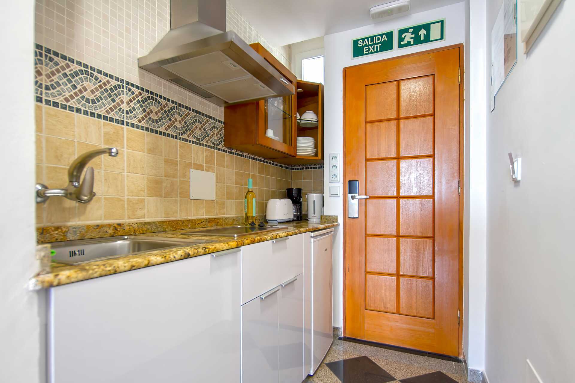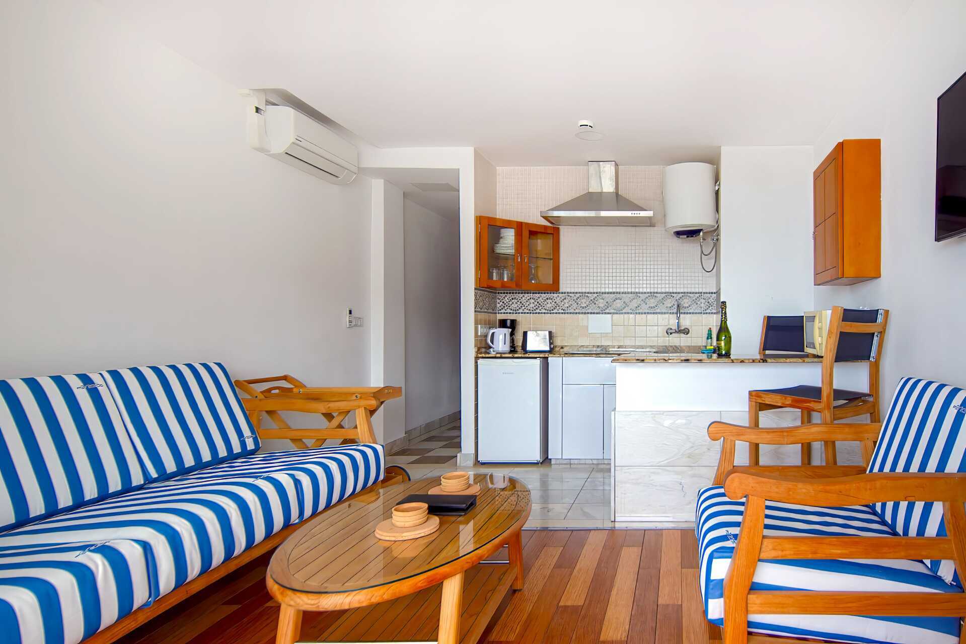 2-værelses lejlighed med balkon, nogle med havudsigt eller med delvis havudsigt. Soveværelse og kombineret opholdsrum/minikøkken. 2-værelses lejlighederne med terrasse har et separat soveværelse, men der er ingen dør mellem soveværelset og opholdsrummet. En dobbeltseng eller to enkeltsenge. Minikøkken med kogeplader, køleskab, kaffemaskine, el-kedel, brødrister og enkelt køkkenudstyr. Nogle lejligheder har en bardisk som spiseplads. Gratis wifi. Aircondition og deponering mod betaling. Tv med internationale kanaler. Hårtørrer. Badeværelse med bruser og toilet. Rengøring 5 gange om ugen.
