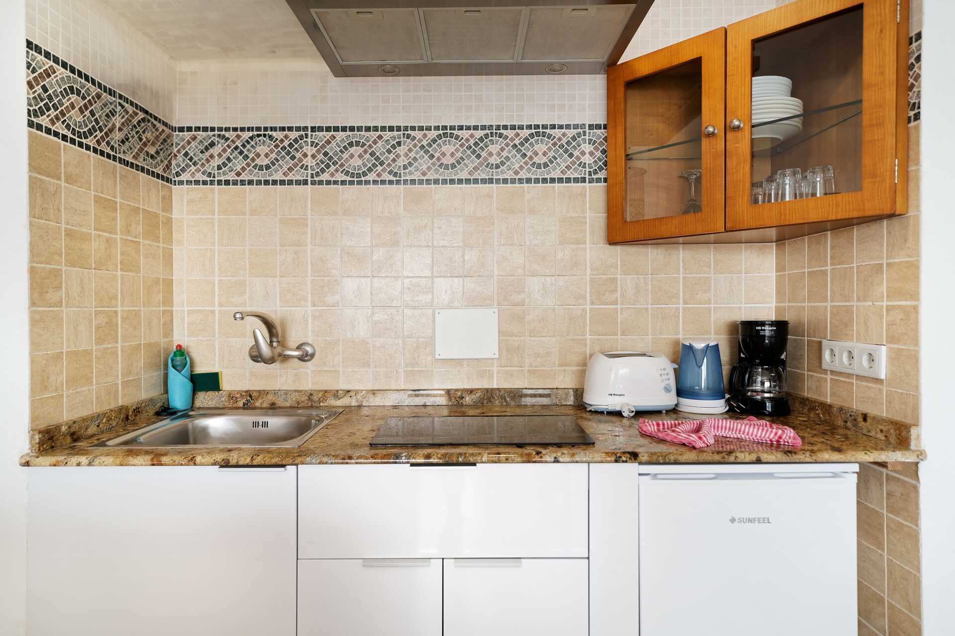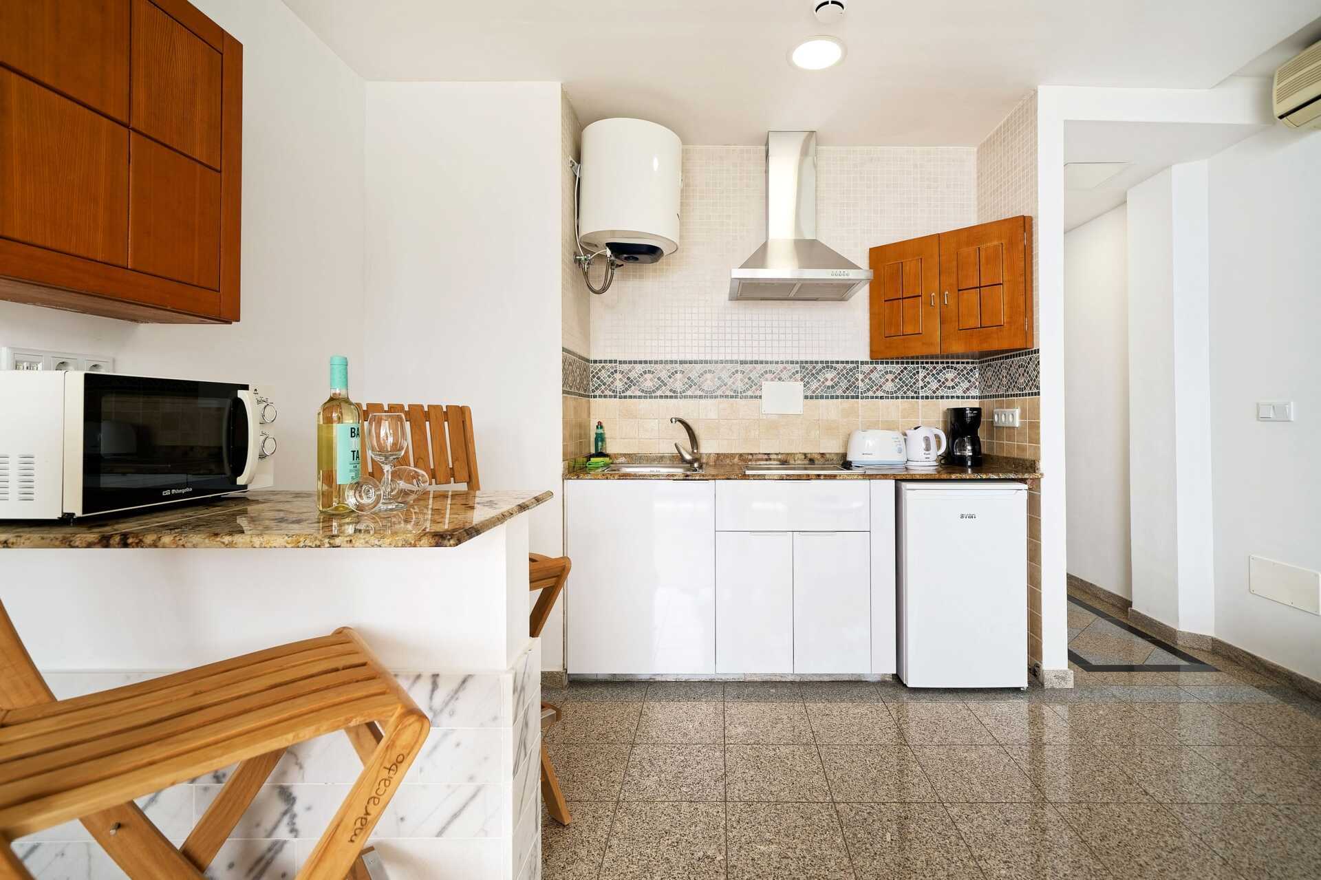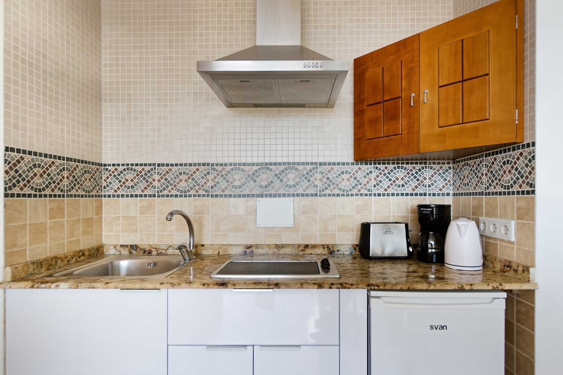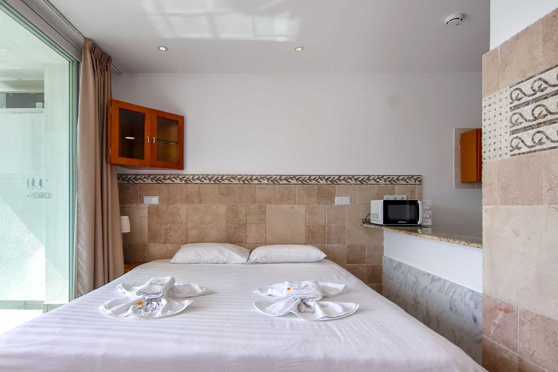 1-værelses lejligheder med balkon, nogle med delvis havudsigt. Kombineret soveværelse og minikøkken. En dobbeltseng. Minikøkken med kogeplader, køleskab, kaffemaskine, el-kedel, brødrister og enkelt køkkenudstyr. Nogle lejligheder har en bardisk som spiseplads. Gratis wifi. Aircondition og deponering mod betaling. Tv med internationale kanaler. Hårtørrer. Badeværelse med bruser og toilet. Rengøring 5 gange om ugen.