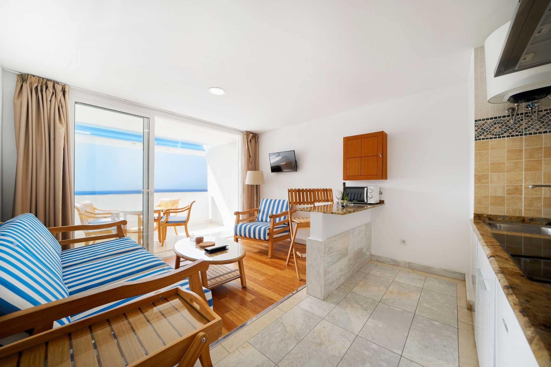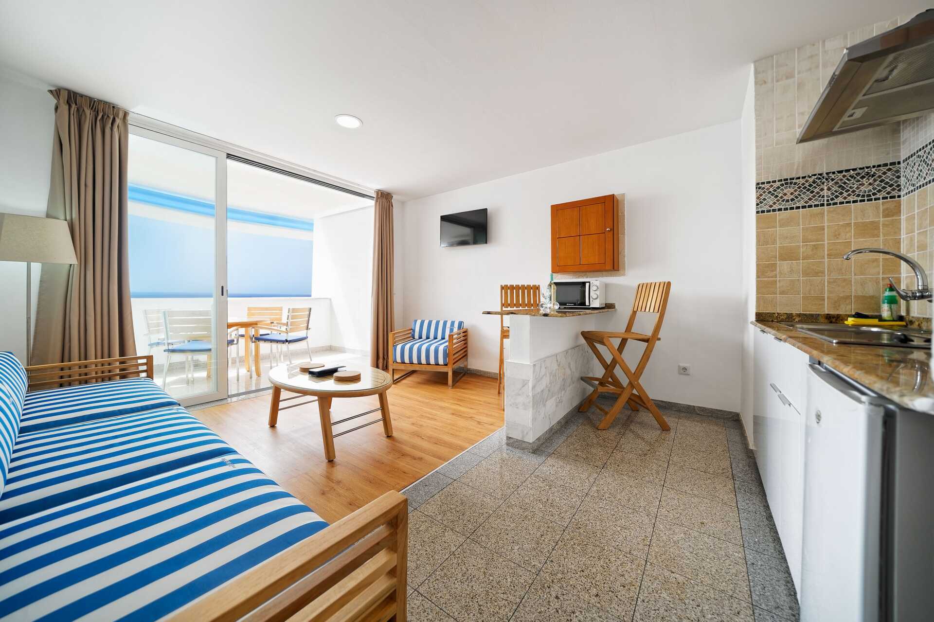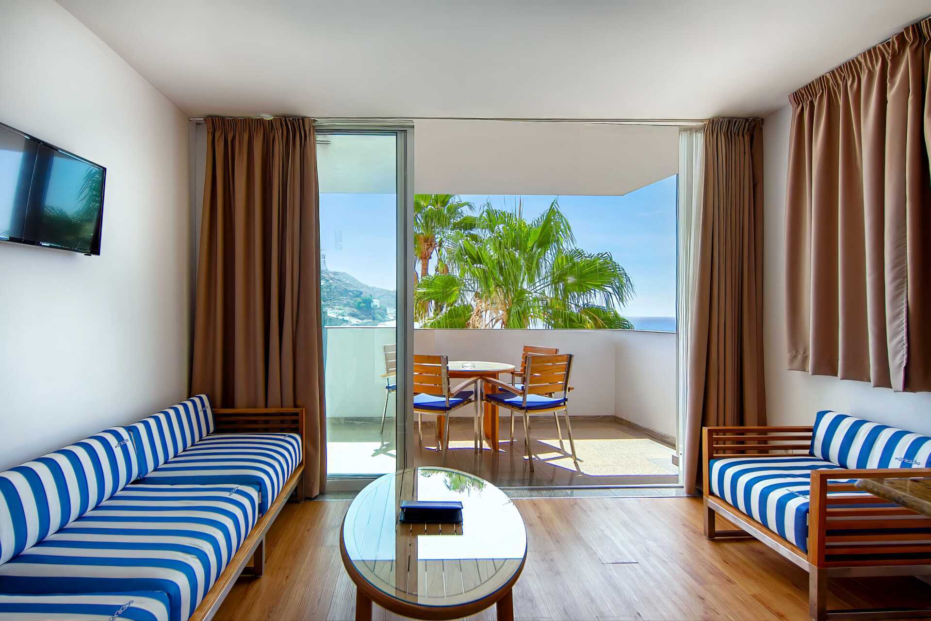 3-værelses lejlighed superior med balkon og havudsigt. Lejlighederne ligger på anden, tredje eller fjerde sal. To soveværelser og kombineret opholdsrum/minikøkken. Et soveværelse med dobbeltseng og et soveværelse med to enkeltsenge. Mulighed for ekstra opredning i sovesofa. Minikøkken med kogeplader, køleskab, kaffemaskine, el-kedel, brødrister og enkelt køkkenudstyr. Nogle lejligheder har en bardisk som spiseplads. Gratis wifi og aircondition. Deponering mod betaling. Tv med internationale kanaler. Hårtørrer. Badeværelse med bruser og toilet. Rengøring 6 gange om ugen.