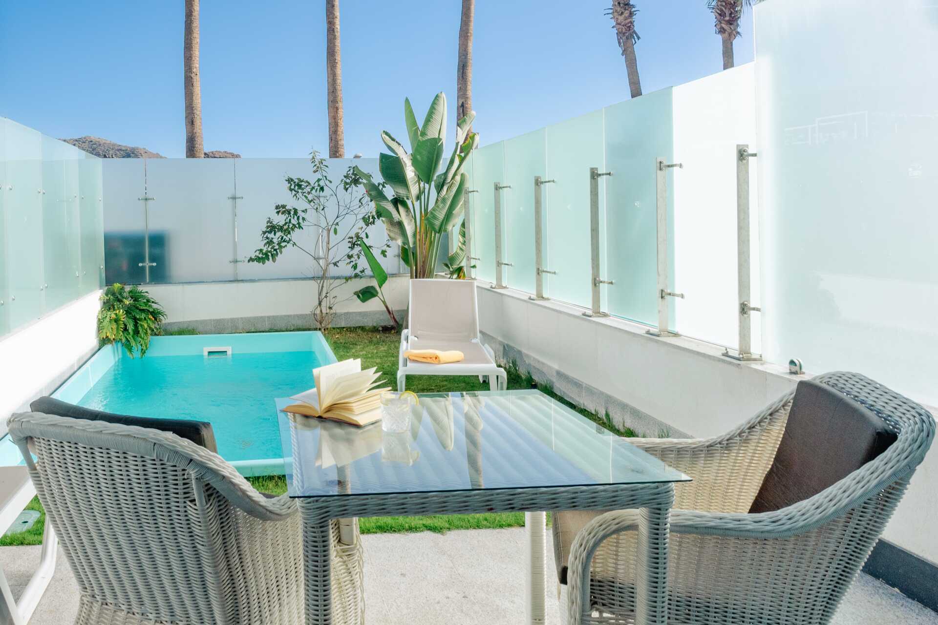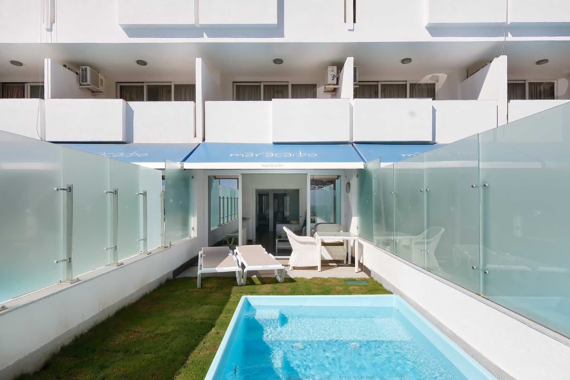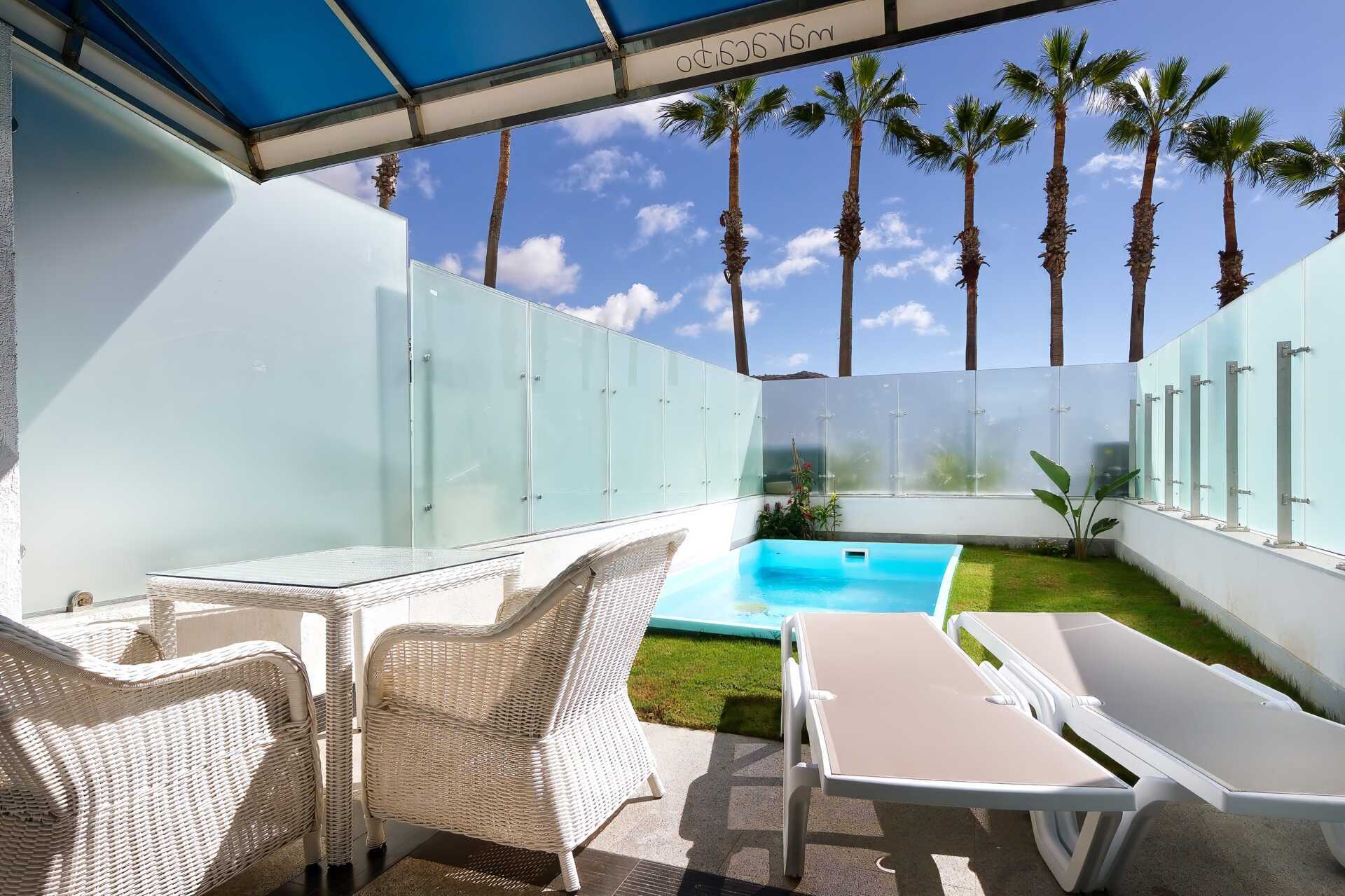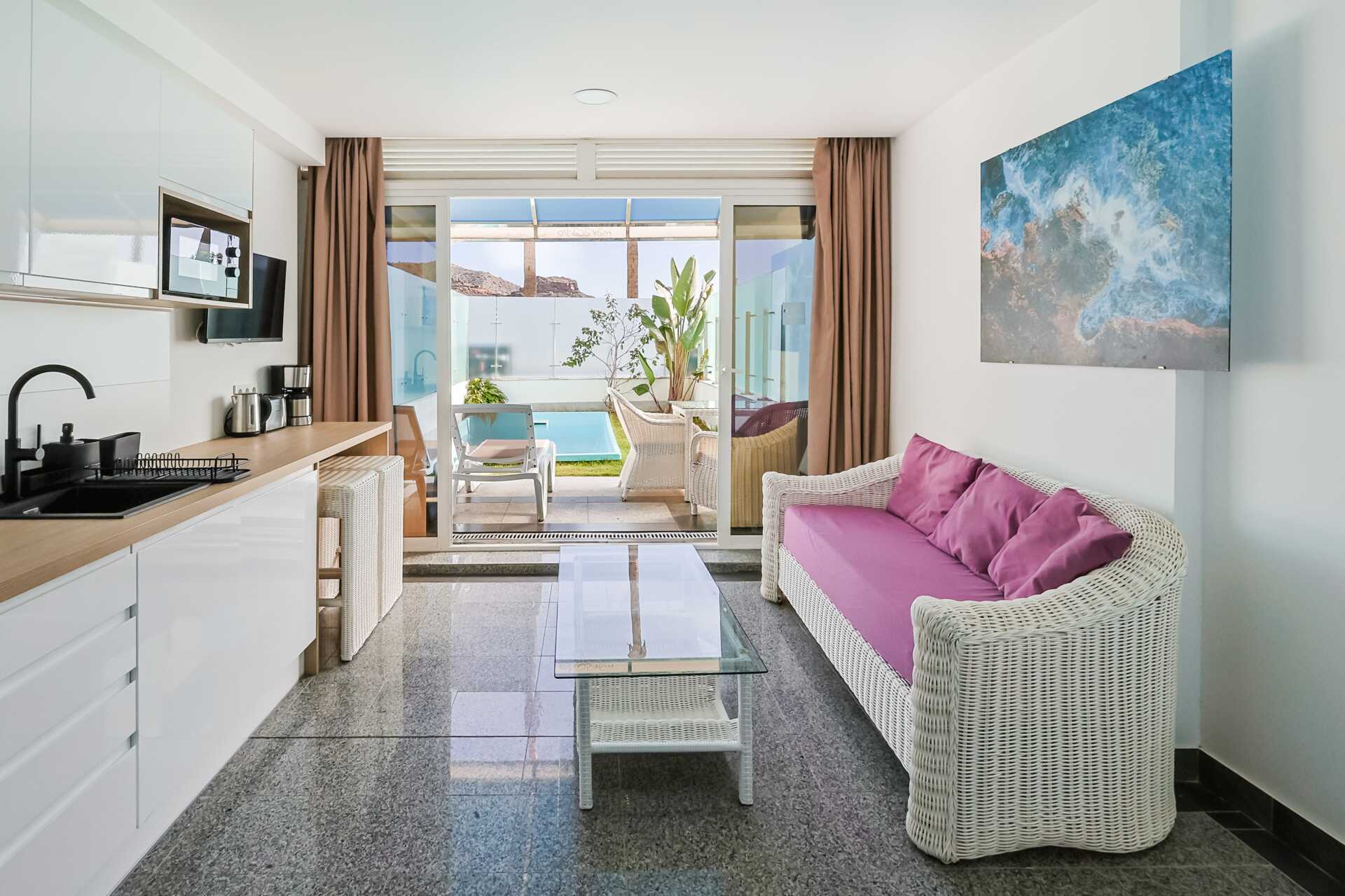 2-værelses lejlighed deluxe med privat pool På terrassen er der to solstole, bord og lænestole og en lille græsplæne. Soveværelse og kombineret opholdsrum/minikøkken. En dobbeltseng. Minikøkken med kogeplader, køleskab, kaffemaskine, el-kedel, brødrister og enkelt køkkenudstyr. Spiseområdet kan være ved bardisken. Gratis wifi, aircondition og deponering. Tv med internationale kanaler. Badekåber. Hårtørrer. Badkar med bruser og toilet. Rengøring 7 gange om ugen.