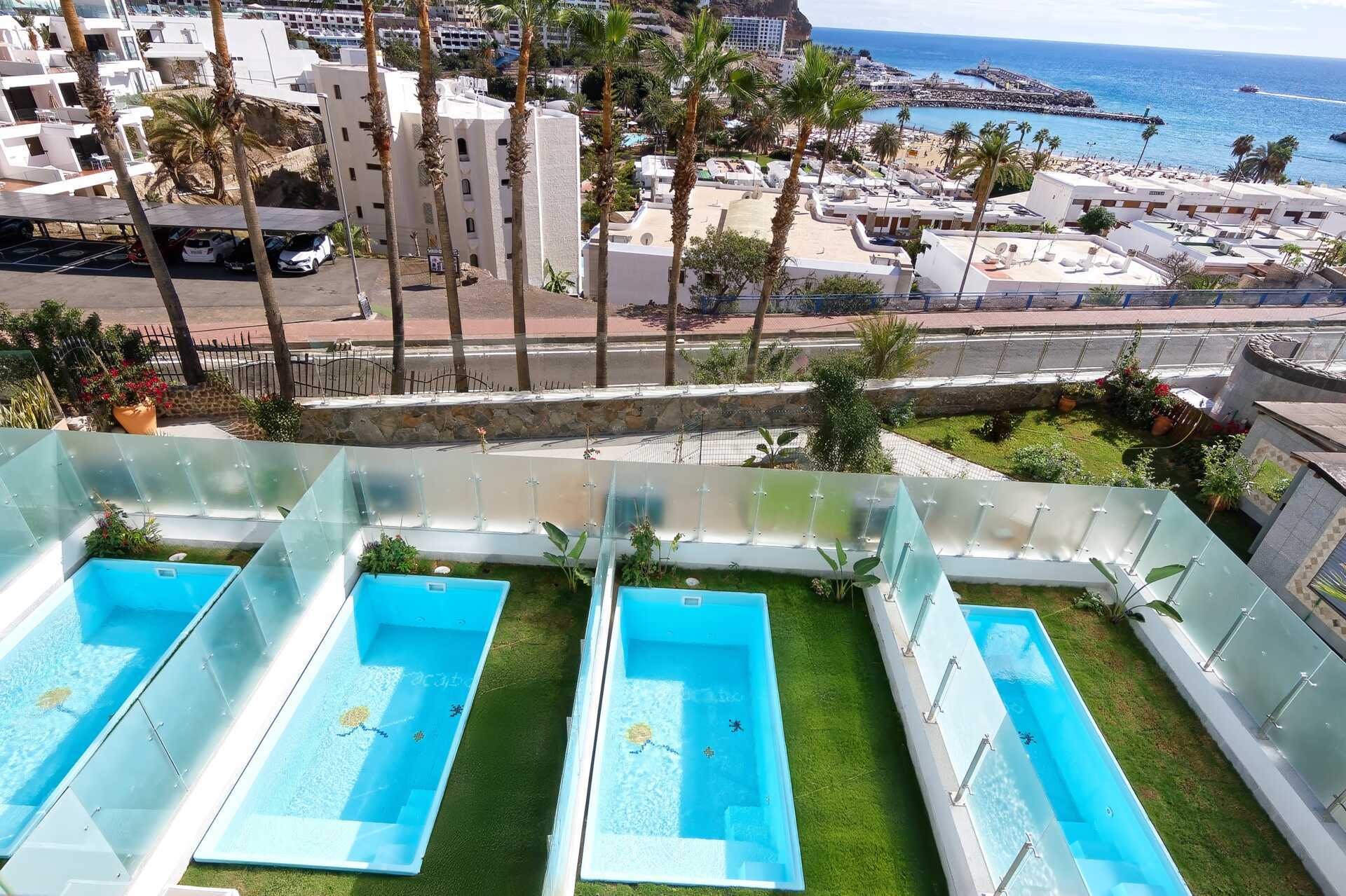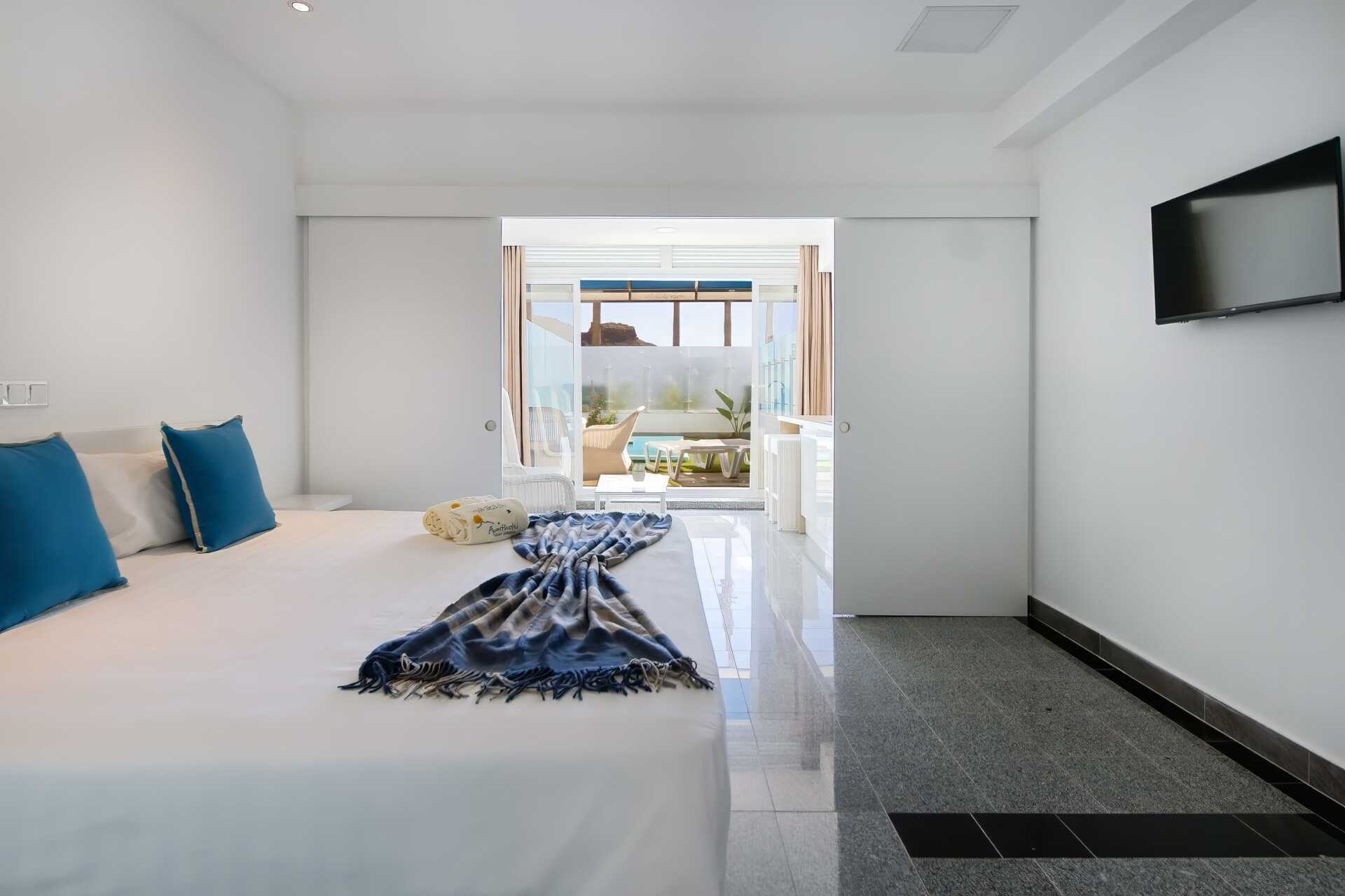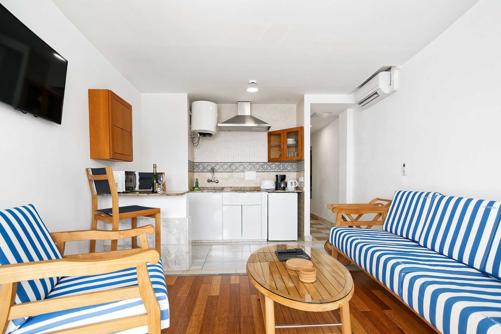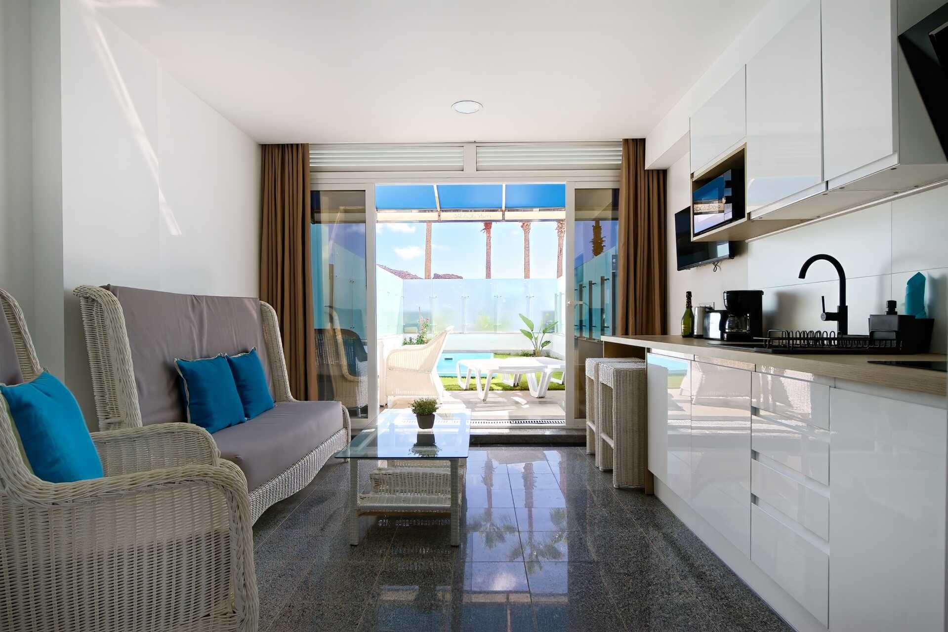 2-værelses lejlighed deluxe med privat pool På terrassen er der to solstole, bord og lænestole og en lille græsplæne. Soveværelse og kombineret opholdsrum/minikøkken. En dobbeltseng. Minikøkken med kogeplader, køleskab, kaffemaskine, el-kedel, brødrister og enkelt køkkenudstyr. Spiseområdet kan være ved bardisken. Gratis wifi, aircondition og deponering. Tv med internationale kanaler. Badekåber. Hårtørrer. Badkar med bruser og toilet. Rengøring 7 gange om ugen.
