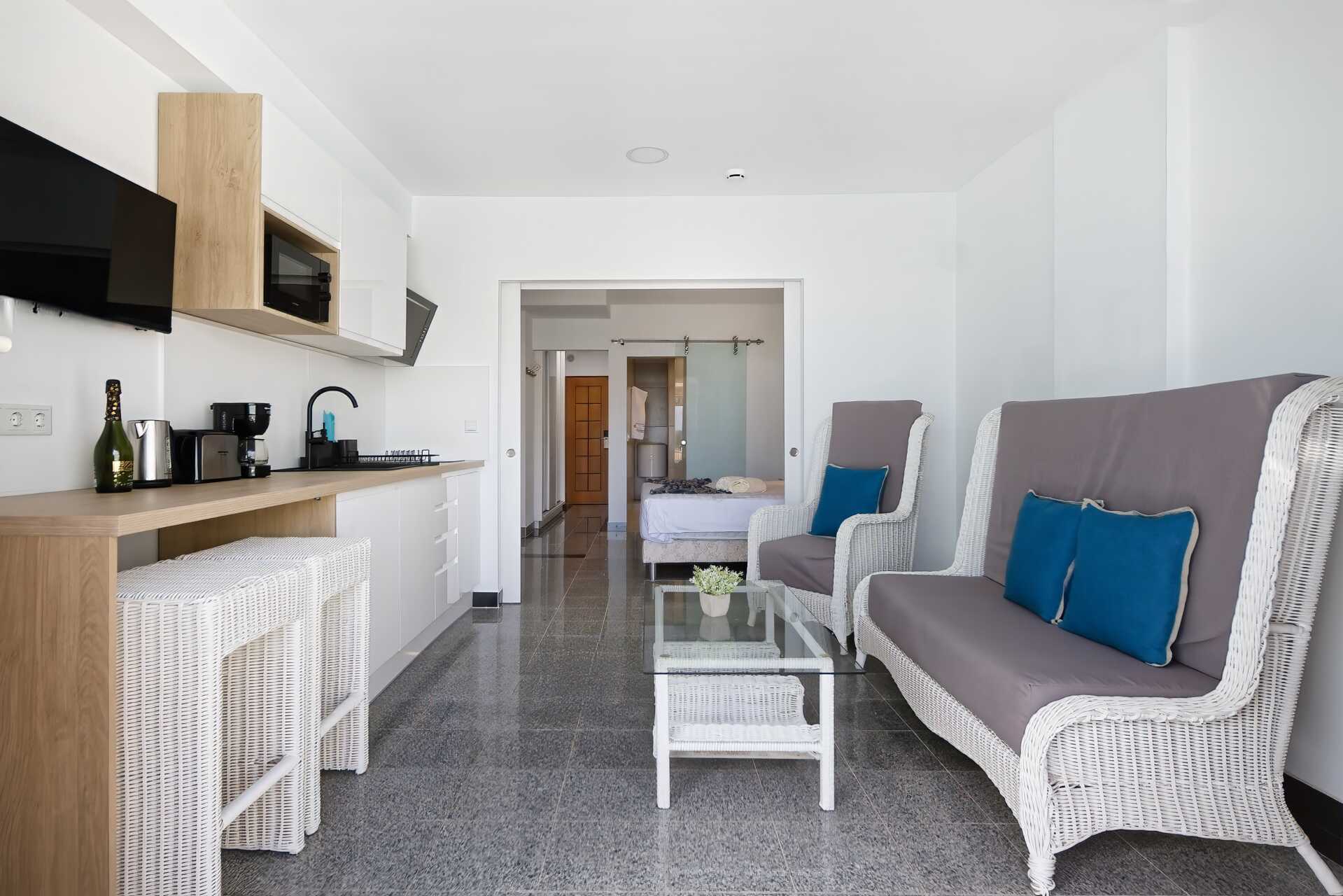 3-værelses lejlighed med balkon, nogle med delvis havudsigt eller med havudsigt. Soveværelse og kombineret opholdsrum med minikøkken. 2-værelses lejlighederne med terrasse har et separat soveværelse, men der er ingen dør mellem soveværelset og opholdsrummet. En dobbeltseng eller to enkeltsenge. Minikøkken med kogeplader, køleskab, kaffemaskine, el-kedel, mikroovn, brødrister og enkelt køkkenudstyr. Nogle lejligheder har en bardisk som spiseplads. Gratis wifi. Aircondition og deponering mod betaling. Tv med internationale kanaler. Hårtørrer. Badeværelse med bruser og toilet. Rengøring 5 gange om ugen.