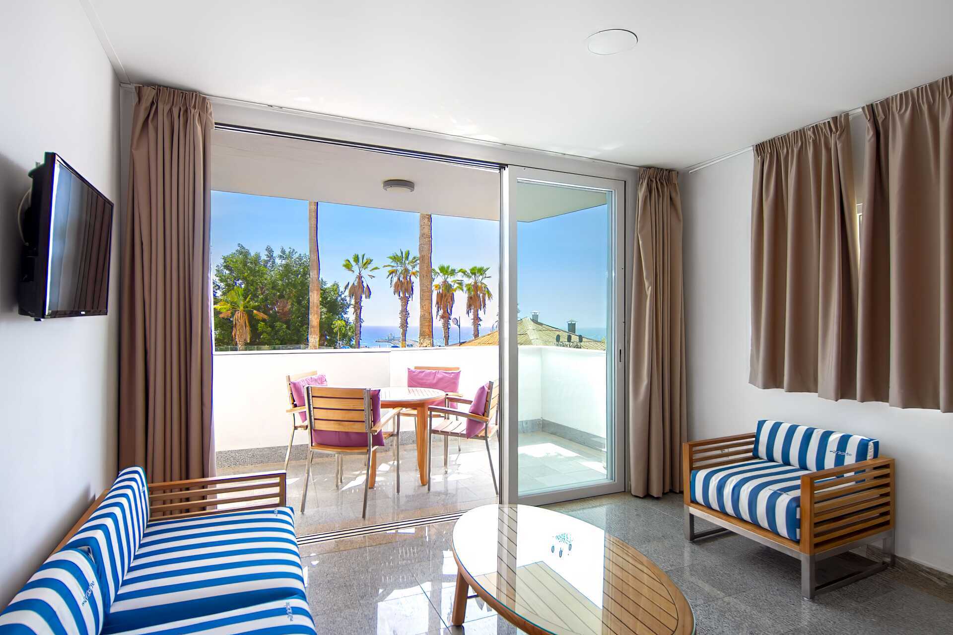 2-værelses lejlighed superior med balkon og havudsigt. Lejlighederne er beliggende på tredje eller fjerde etage. Et soveværelse og et kombineret opholdsrum med minikøkken. En dobbeltseng eller to enkeltsenge. Mulighed for ekstra opredning i sovesofa. Minikøkken med kogeplader, køleskab, kaffemaskine, el-kedel, brødrister og enkelt køkkenudstyr. Nogle lejligheder har en bardisk som spiseplads. Gratis wifi og aircondition. Deponering mod betaling. Tv med internationale kanaler. Hårtørrer. Badeværelse med bruser og toilet. Rengøring 6 gange om ugen.