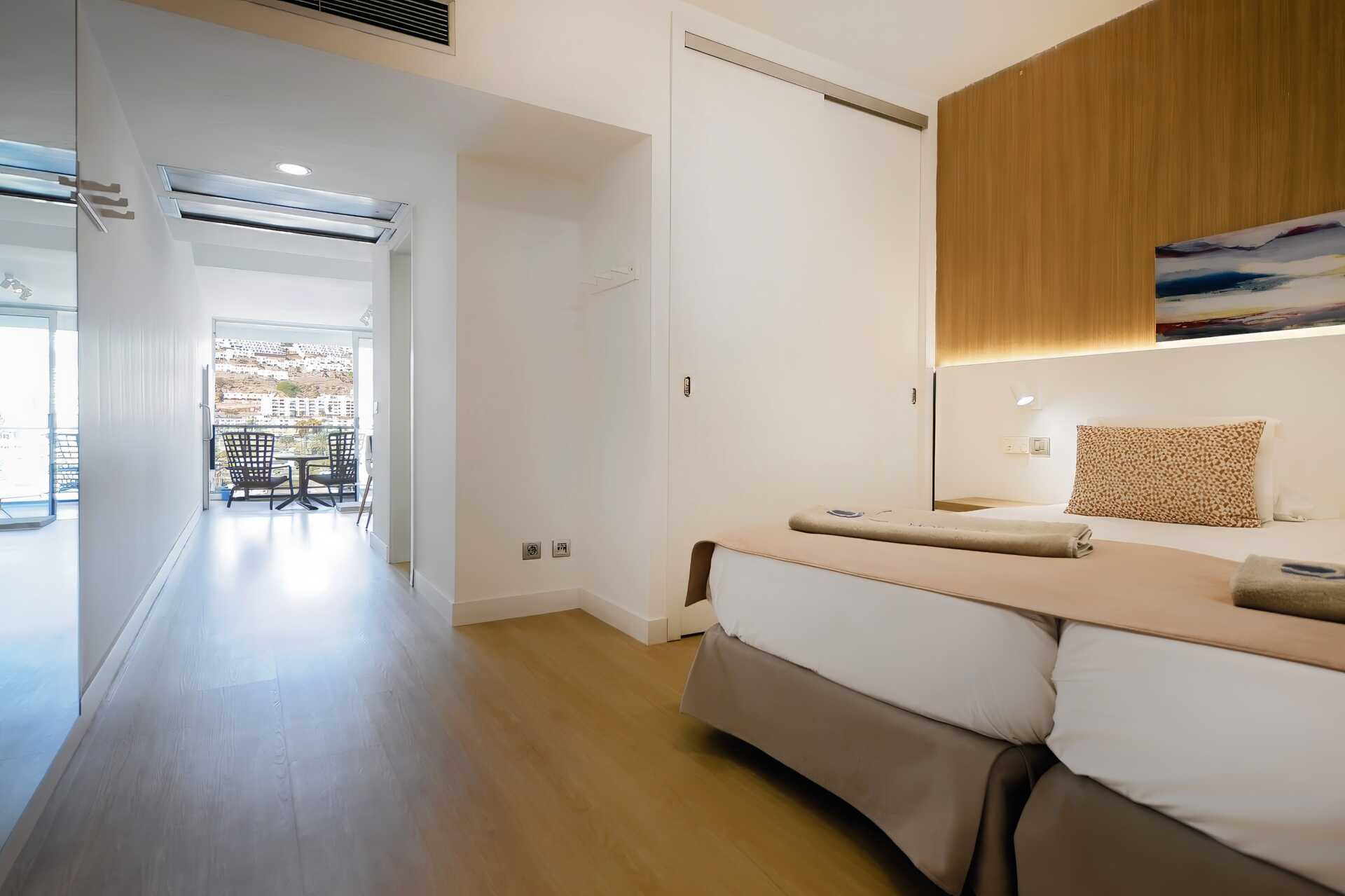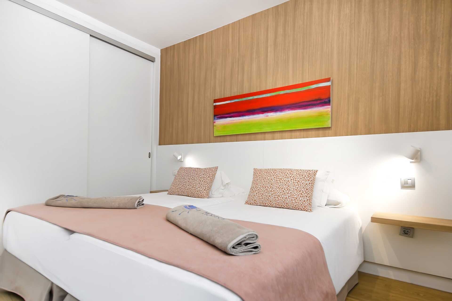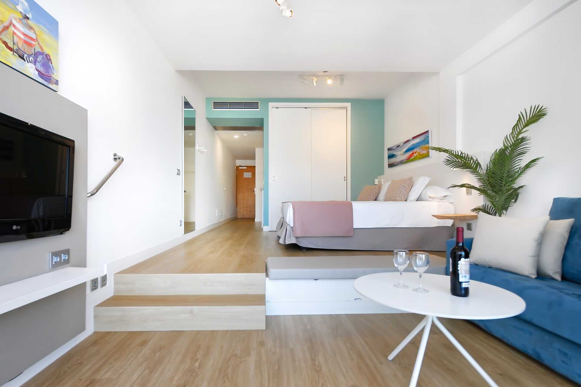 2-værelses lejlighed med balkon eller terrasse. Nogle balkoner er i stueplan. Soveværelse og kombineret opholdsrum med minikøkken. I nogle lejligheder er der ingen dør til soveværelset. Minikøkkenet er adskilt fra opholdsrummet med to trin. To enkeltsenge. Mulighed for ekstra opredning i sovesofa. Minikøkken med køleskab og fryser, kogeplader, mikrobølgeovn, kaffemaskine, brødrister, el-kedel og enkelt køkkenudstyr. Gratis wifi og aircondition. Deponering mod betaling. Tv med internationale kanaler. Hårtørrer. Badeværelse med badekar eller bruser samt toilet. Rengøring 7 gange om ugen.
