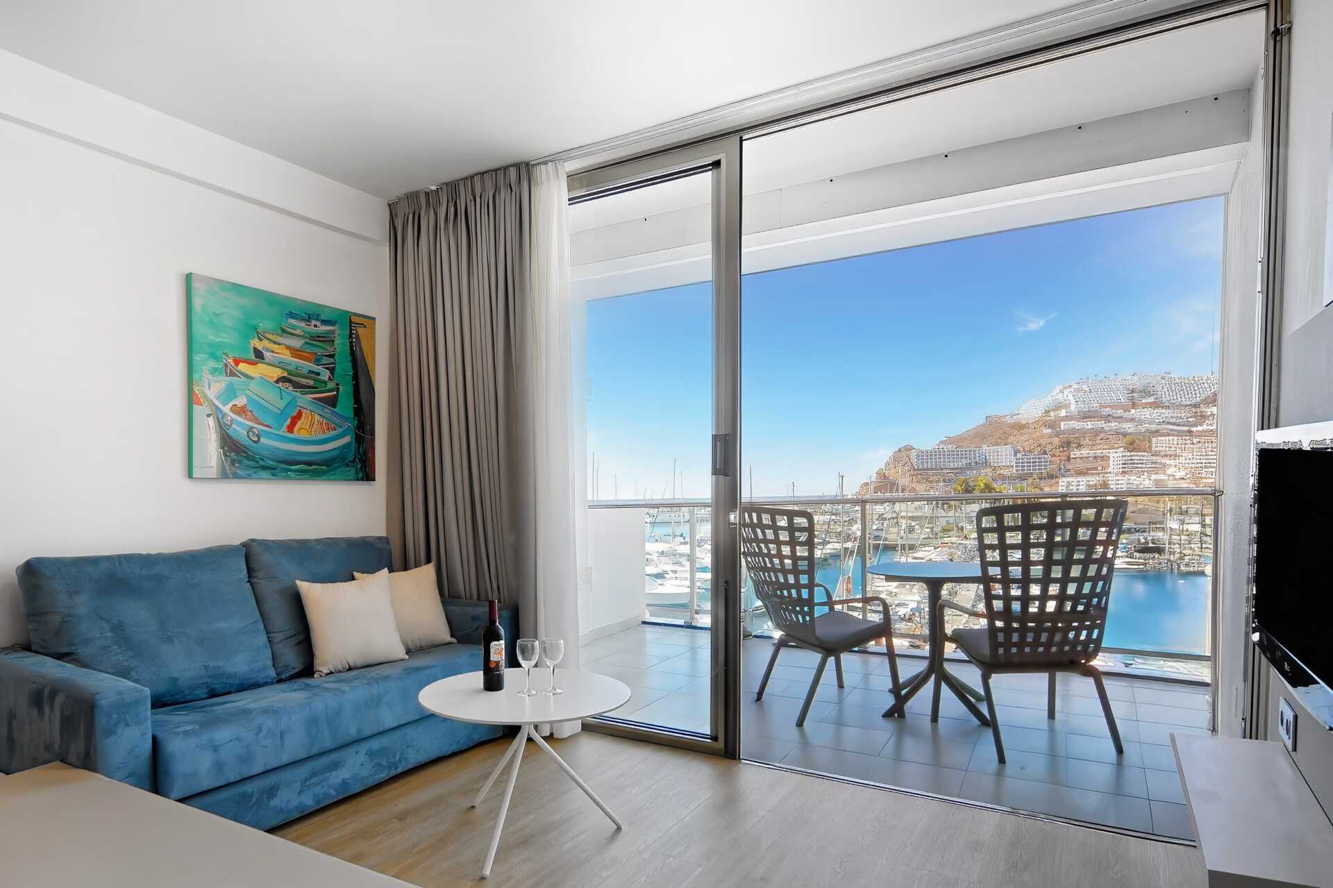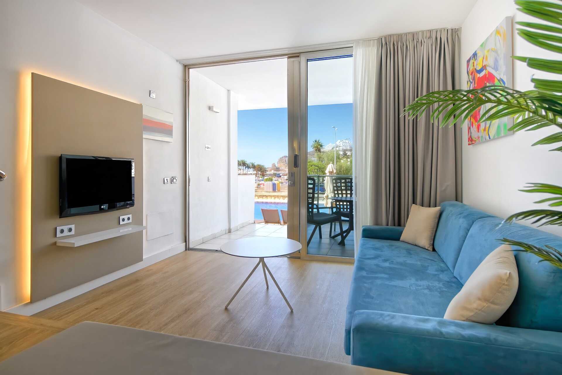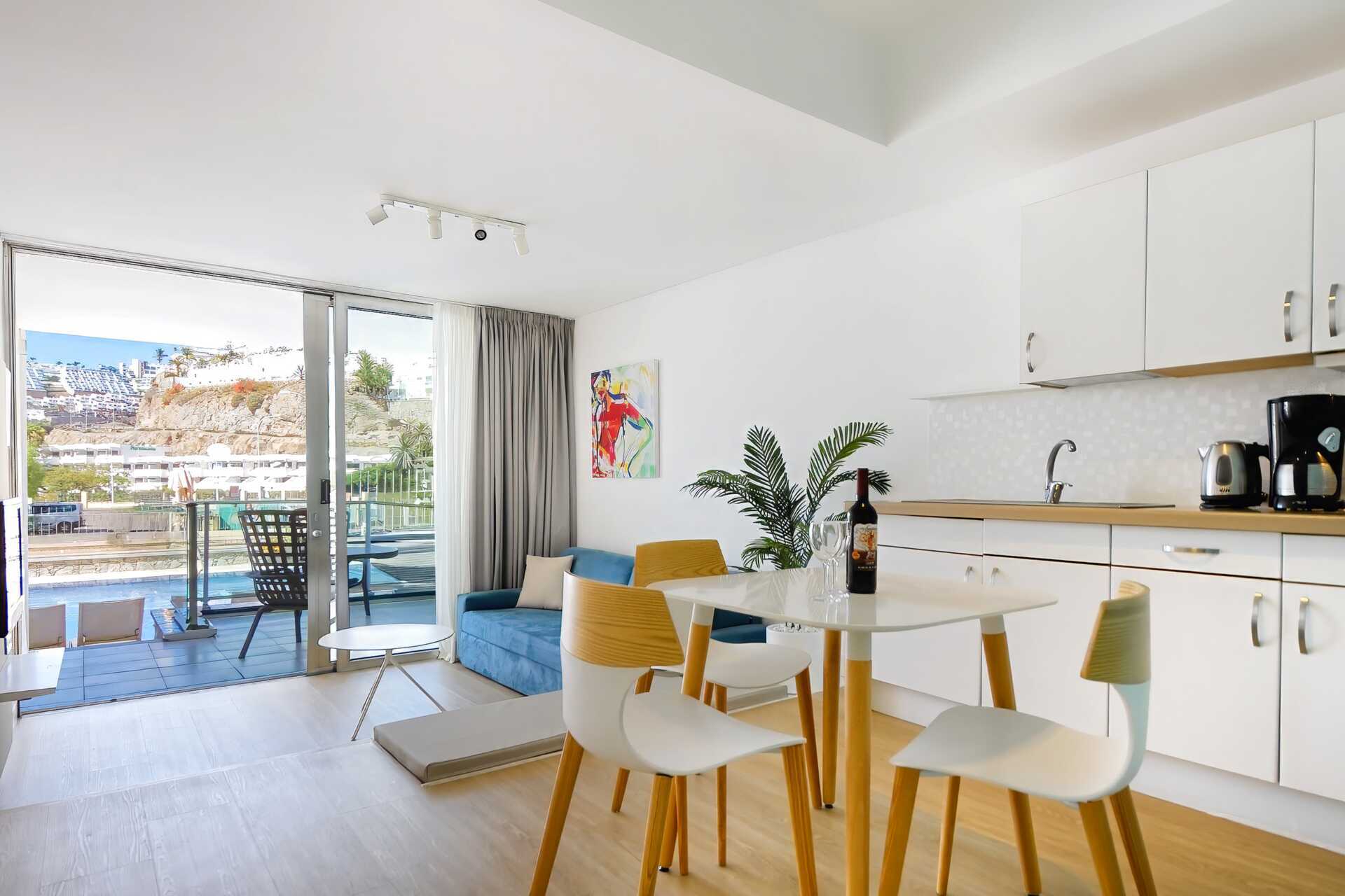 2-værelses lejlighed med balkon eller terrasse. Nogle balkoner er i stueplan. Soveværelse og kombineret opholdsrum med minikøkken. I nogle lejligheder er der ingen dør til soveværelset. Minikøkkenet er adskilt fra opholdsrummet med to trin. To enkeltsenge. Mulighed for ekstra opredning i sovesofa. Minikøkken med køleskab og fryser, kogeplader, mikrobølgeovn, kaffemaskine, brødrister, el-kedel og enkelt køkkenudstyr. Gratis wifi og aircondition. Deponering mod betaling. Tv med internationale kanaler. Hårtørrer. Badeværelse med badekar eller bruser samt toilet. Rengøring 7 gange om ugen.