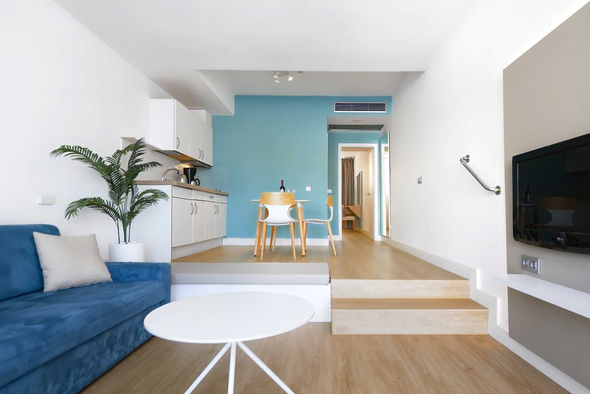 1-værelses lejlighed med balkon eller terrasse. Nogle balkoner er placeret i stueplan. Soveværelse kombineret med opholdsrum med minikøkken. Spiseplads på udepladsen. Minikøkkenet er adskilt fra opholdsrummet med to trin. To enkeltsenge. Minikøkken med køleskab og fryser, kogeplader, mikrobølgeovn, kaffemaskine, brødrister, el-kedel og enkelt køkkenudstyr. Gratis wifi og aircondition. Deponering mod betaling. Tv med internationale kanaler. Hårtørrer. Badeværelse med badekar eller bruser samt toilet. Rengøring 7 gange om ugen.