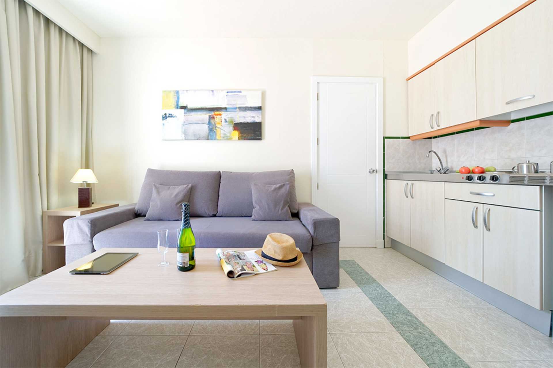 2-værelses lejlighed i bungalow med terrasse i stueplan. Soveværelse og kombineret opholdsrum med minikøkken. To enkeltsenge. Mulighed for ekstra opredning i sovesofa. Minikøkken med køleskab, kogeplader, mikroovn, kaffemaskine, el-kedel og enkelt køkkenudstyr. Gratis wifi. Aircondition og deponering mod betaling. Tv med internationale kanaler. Hårtørrer. Badeværelse med badekar og toilet. Rengøring 3 gange om ugen. Børn under to år tæller med i det maksimale antal personer på værelset.