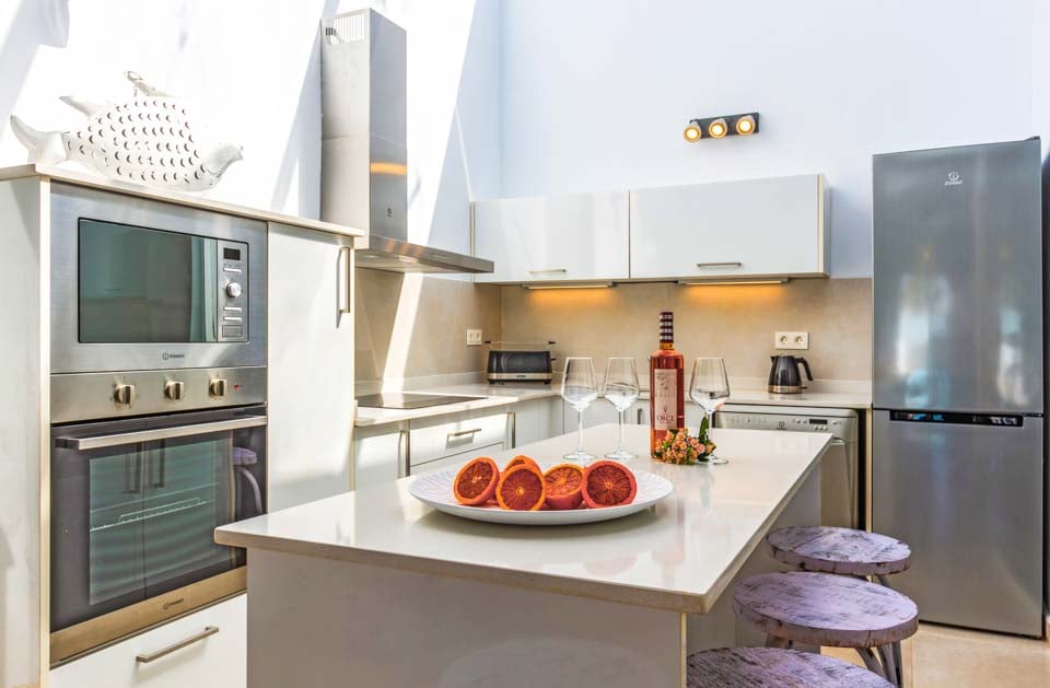 Gå ind i villaen gennem de smarte porte og nyd en indbydende følelse af plads og ro. Den dobbelthusejendom er bygget i ét plan og har plads til op til fem gæster. Den er hvidkalket og moderne, bygget og møbleret til en meget høj standard. Det åbne køkken kan prale af en trendy morgenmadsbar, og stuen er oversået med smagfuld kunst, mens glasdøre fra gulv til loft giver masser af naturligt lys og fører til poolterrassen. De tre soveværelser er lyse og udstråler stil takket være deres maritim indretning, der bringer en strandfølelse indenfor.