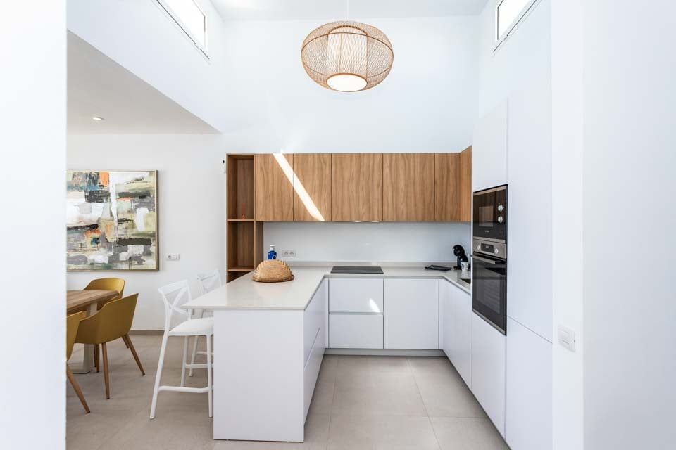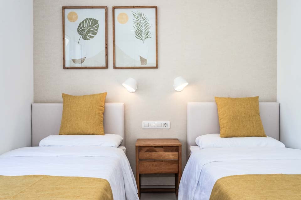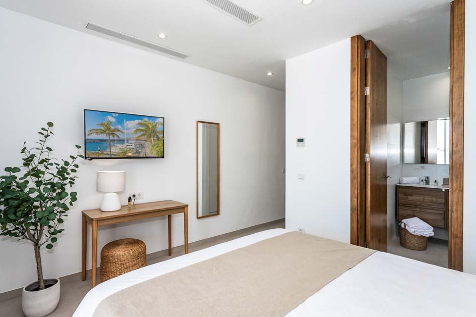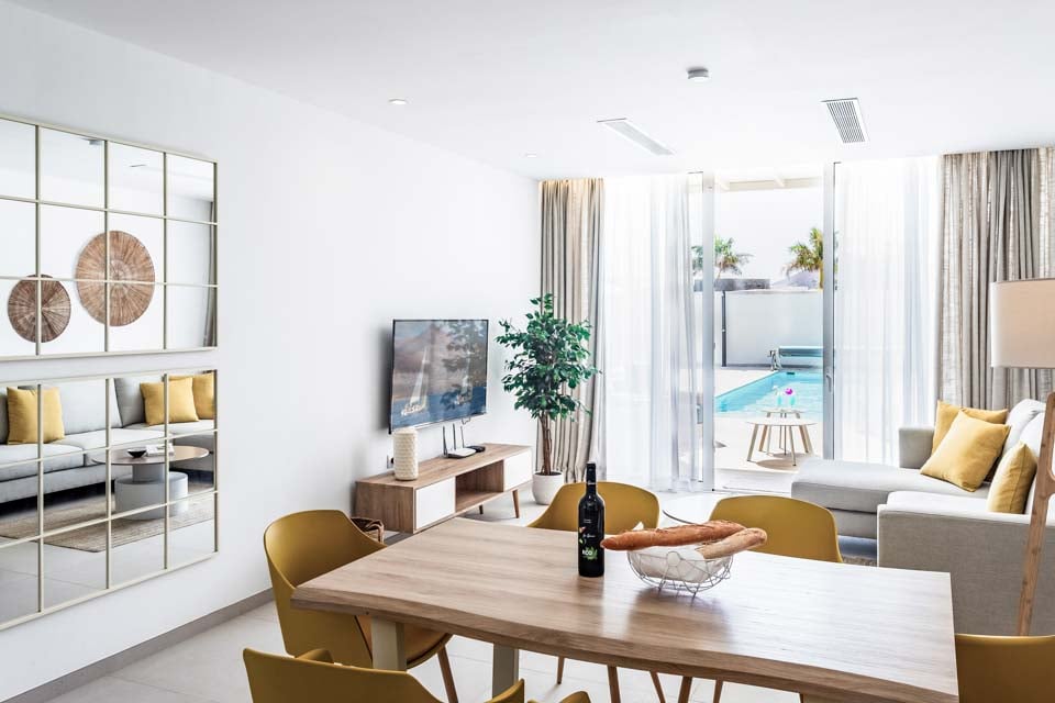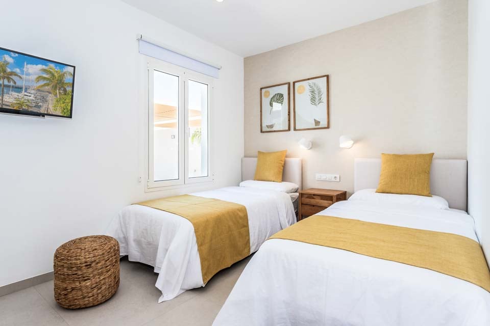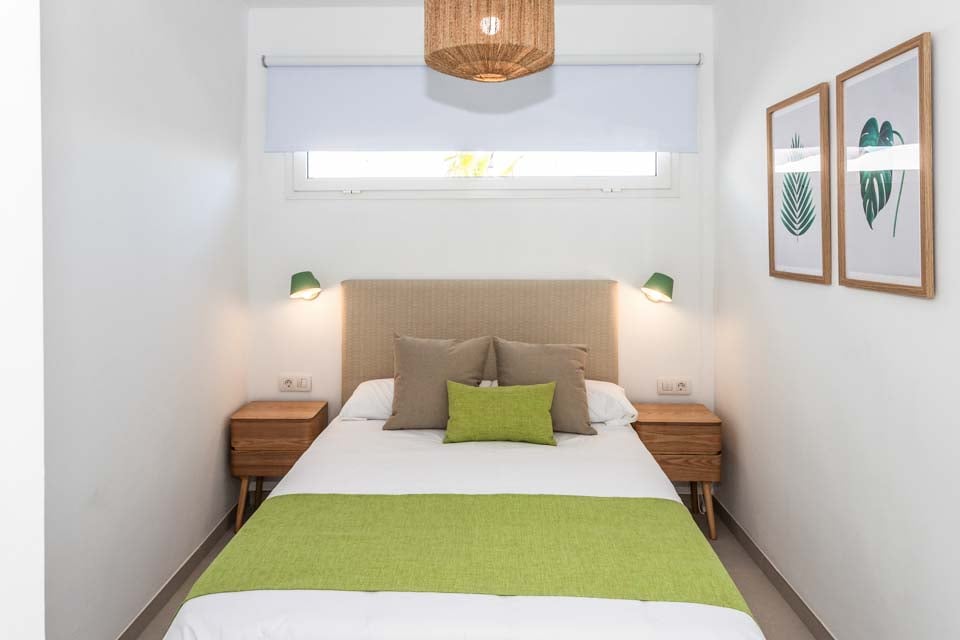 Indvendigt har denne ejendom i stueetagen tre moderne soveværelser, alle med integreret aircondition til de varme sommernætter. En åben stue og køkken tilbyder alt det nødvendige til en ferie med selvhusholdning, herunder opvaskemaskine, mikrobølgeovn, kogeplader og et smart-tv.