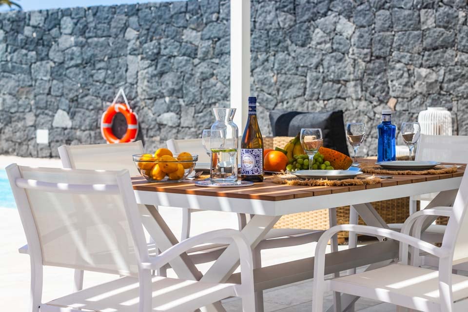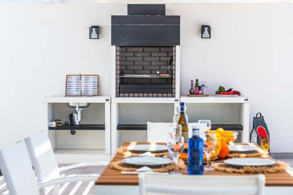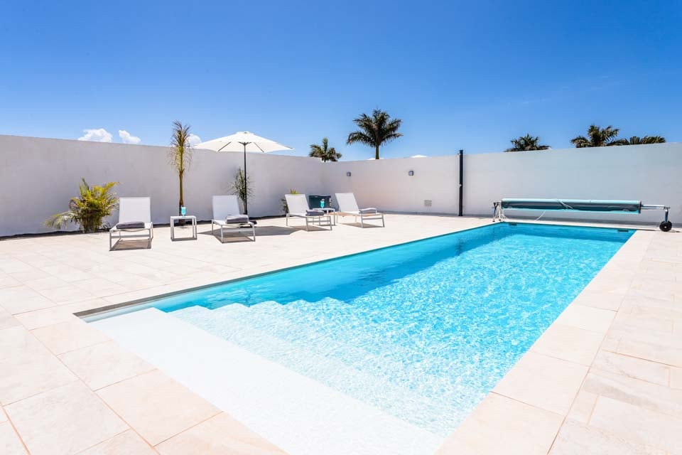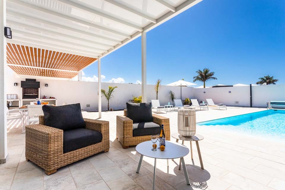 Alternativt kan man tilbringe afslappende dage i villaen. Du finder en stor 10x3m opvarmet* swimmingpool i centrum af terrassen, samtidig med at der er liggestole og små palmer. Der er et hyggeligt siddeområde under den overdækkede terrasse, ideelt til morgenkaffe eller eftermiddagscocktails med en bog. Til dine udendørs spisningsbehov finder du et bord med seks siddepladser og en murstensgrill med en tilstødende vask for ekstra bekvemmelighed.