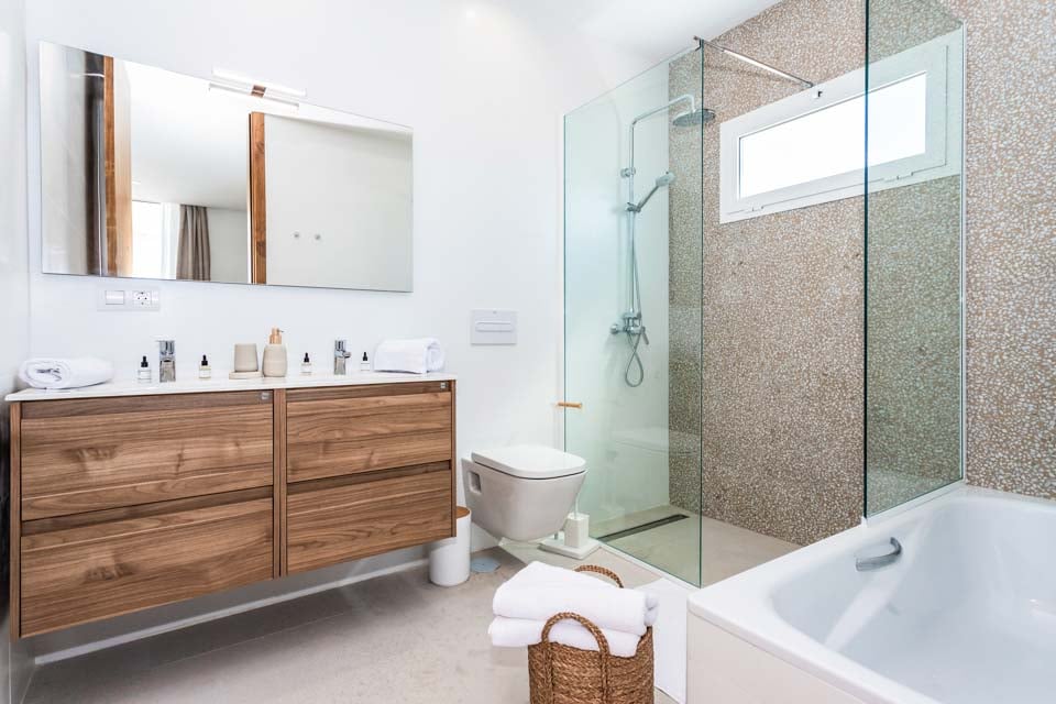 Badekar med bruser over, Bruser, Brusekabine, Håndvask, Dobbelt, Dobbeltvaske, Toilet