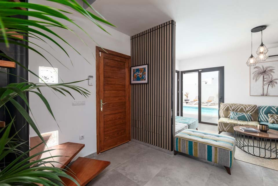 For at komme til villaen er der en 200 cm bred sti langs 1 trin. Hoveddøren har en bredde på 70 cm, mens døren til terrassen er 60 cm bred. Terrassen er åben, flad og flisebelagt. Der er en let kant over terrassedørkarmen. Selve poolen har trinadgang. Alle soveværelser har en dørbredde på 70 cm, mens alle badeværelser har en dørbredde på 60 cm. Der er 18 trin til første sal, som er via en vindeltrappe. Døren ind til køkken/alrum er 209 cm bred, og døren ind til opholdsstuen er også 200 cm bred. *Bemærk venligst, at selvom vi har gjort alt for at sikre, at de givne oplysninger er nøjagtige, kan der forekomme fejl, og hvis du har brug for mere specifik information om villaen, er du velkommen til at kontakte os.