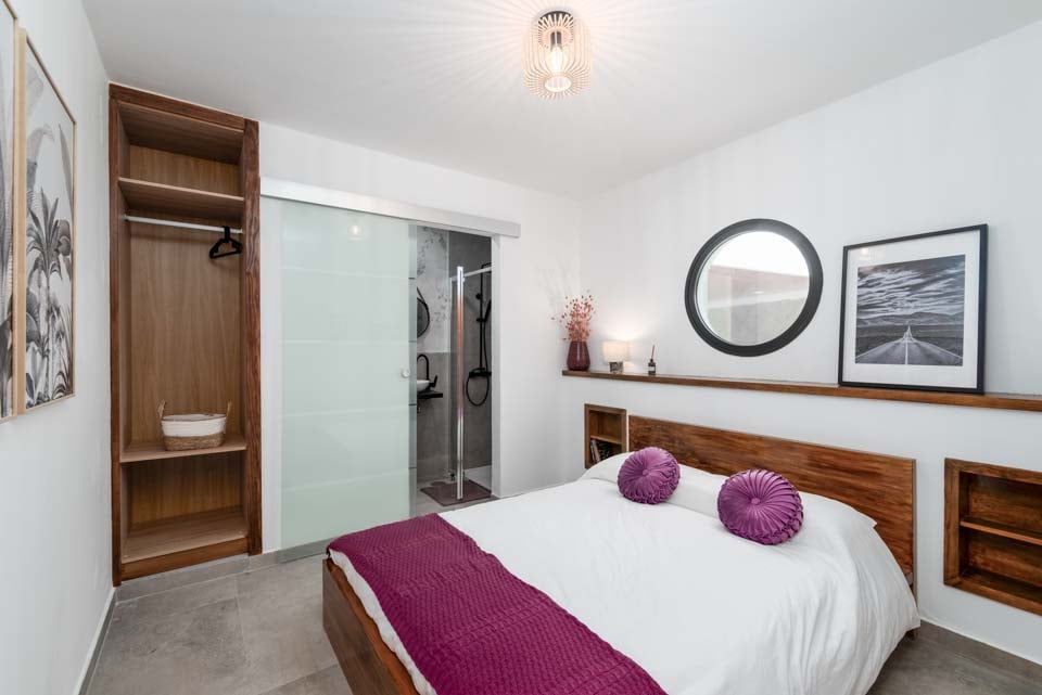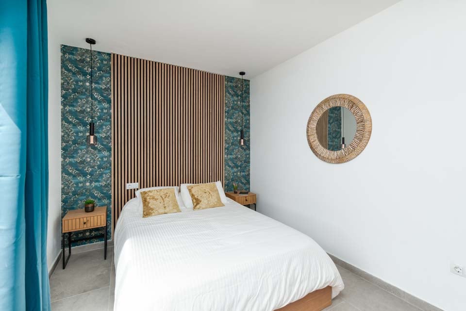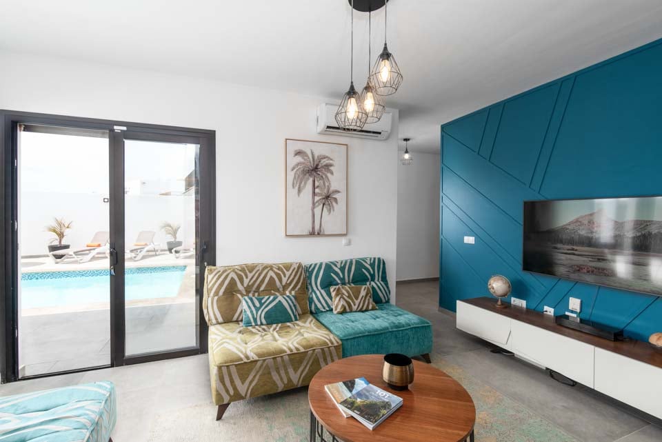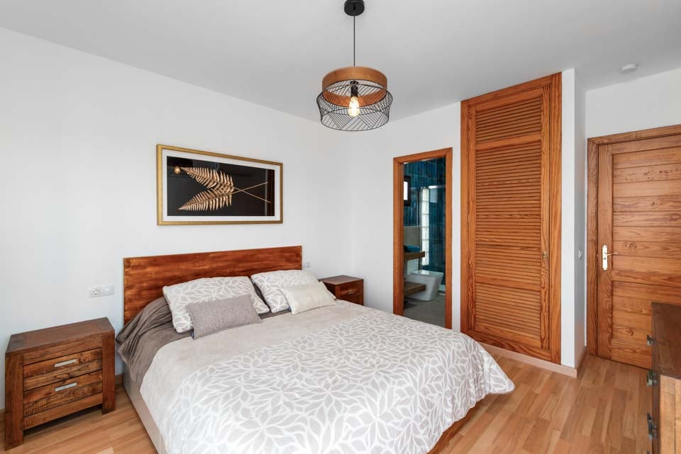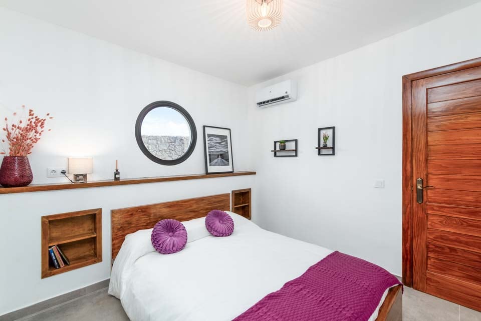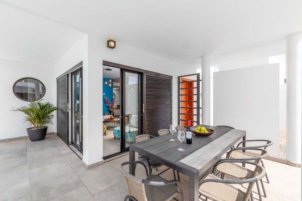Indenfor finder du moderne interiør med farvestrejf, der gør denne ejendom til et hjem væk fra hjemmet. Udover et fuldt udstyret køkken, et bryggers og kølig aircondition finder du alt, hvad du behøver på din ferie med selvhusholdning. Med fire soveværelser og tre badeværelser er denne villa ideel til op til otte gæster. Sørg for at finde soveværelset på første sal med eget badeværelse, balkon og havestole. Et ideelt sted for en drink sent om aftenen!