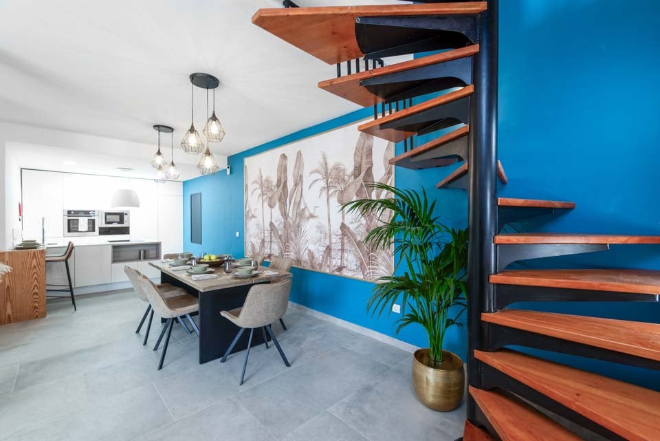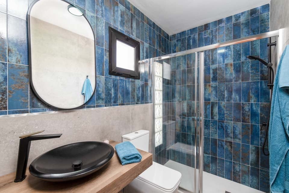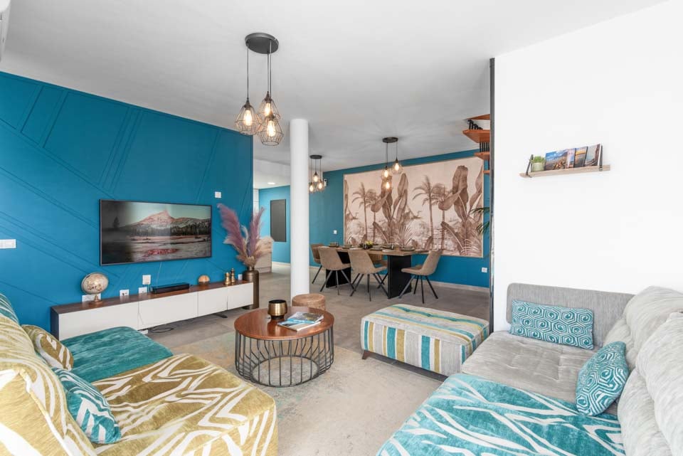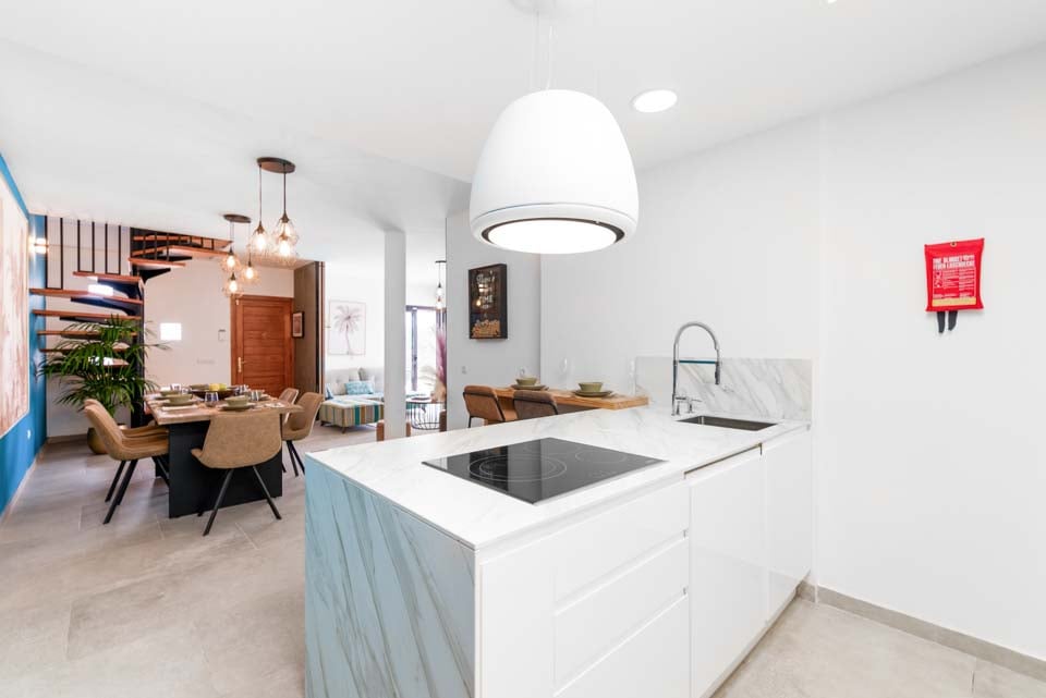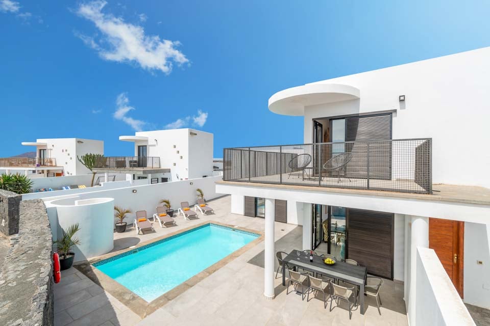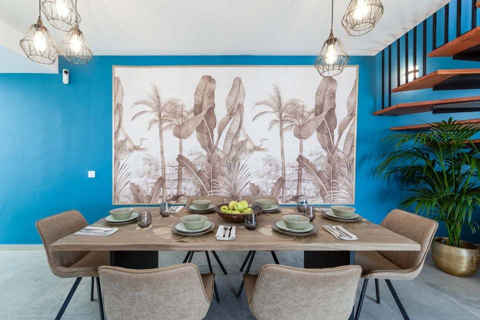 Indenfor finder du moderne interiør med farvestrejf, der gør denne ejendom til et hjem væk fra hjemmet. Udover et fuldt udstyret køkken, et bryggers og kølig aircondition finder du alt, hvad du behøver på din ferie med selvhusholdning. Med fire soveværelser og tre badeværelser er denne villa ideel til op til otte gæster. Sørg for at finde soveværelset på første sal med eget badeværelse, balkon og havestole. Et ideelt sted for en drink sent om aftenen!