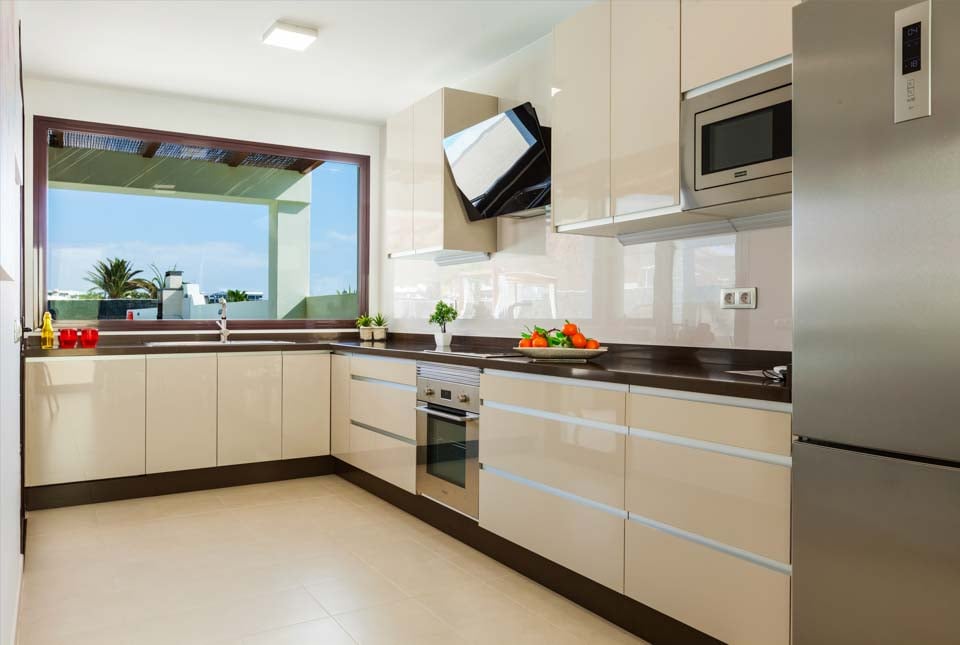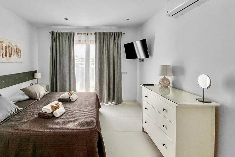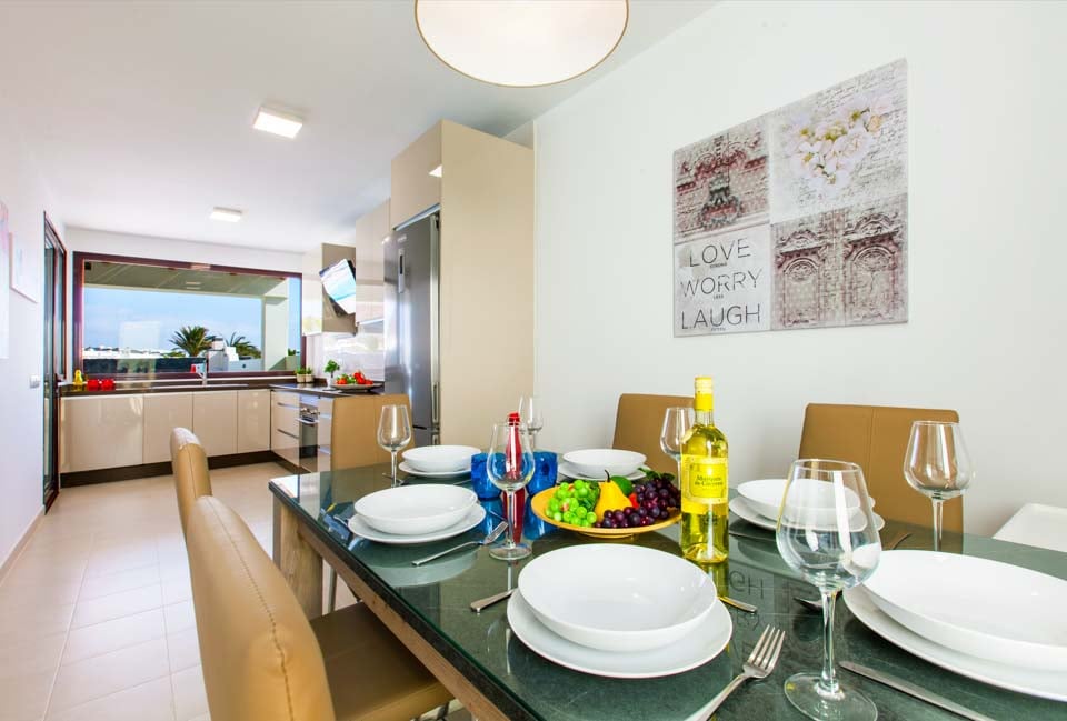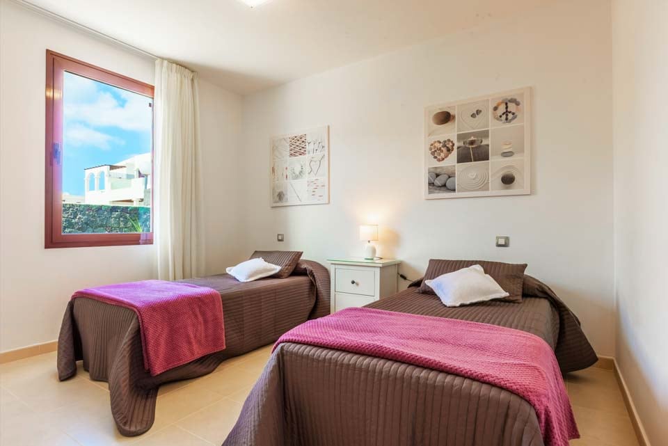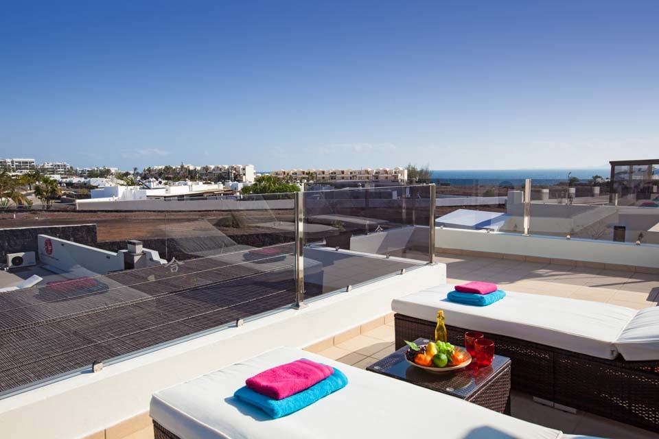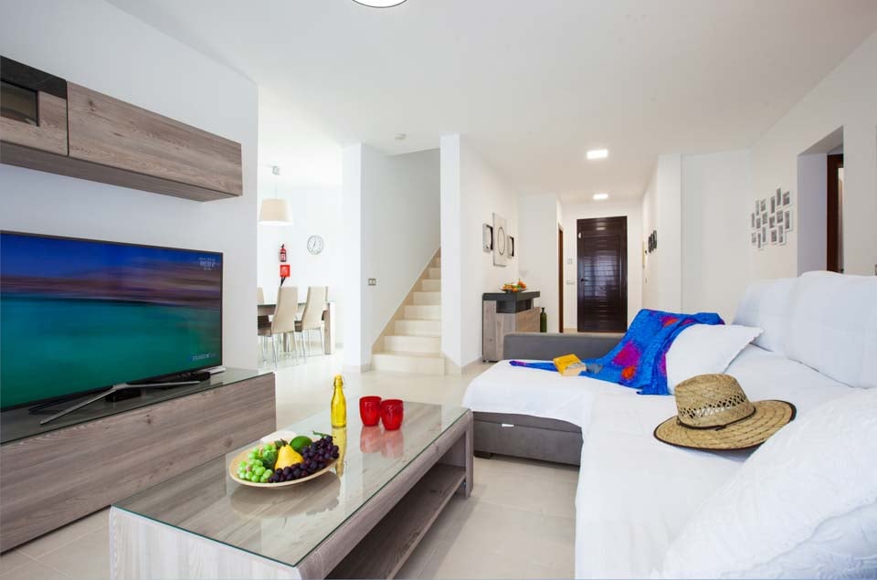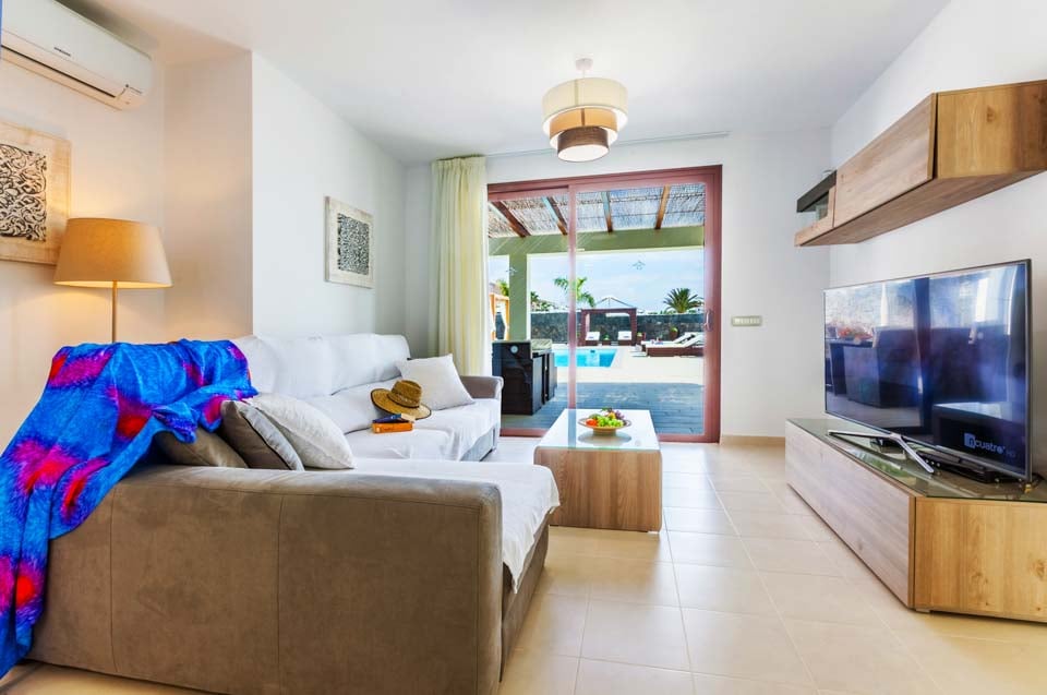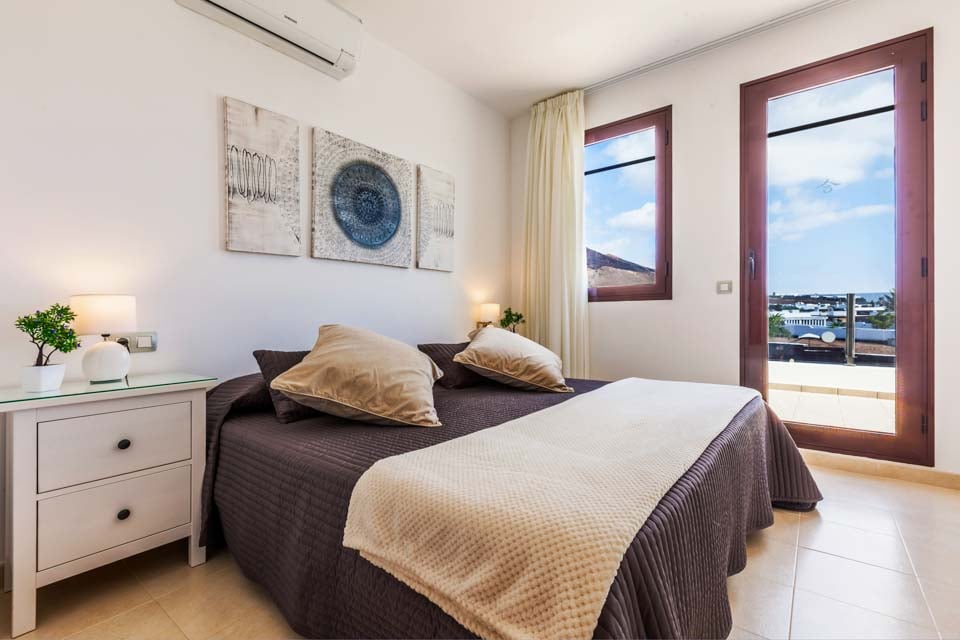 I stueetagen er der en moderne og komfortabel opholdsstue med flere britiske kanaler, spillekonsol og spiseplads til seks personer, der fører videre til et moderne og fuldt udstyret køkken. To soveværelser samt et familiebadeværelse er placeret på denne etage. Trapper fører op til første sal, hvor du finder to soveværelser, et med eget badeværelse og et med separat toilet. Soveværelserne har adgang til den rummelige terrasse med en fantastisk havudsigt til naboøen Fuerteventura. Stuen og alle soveværelser har aircondition for din bekvemmelighed.