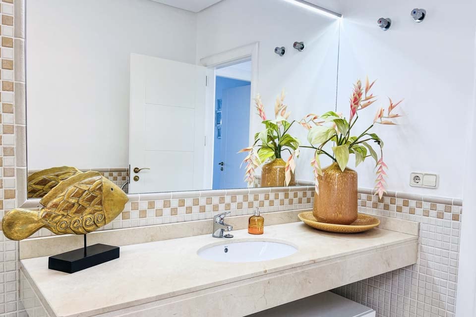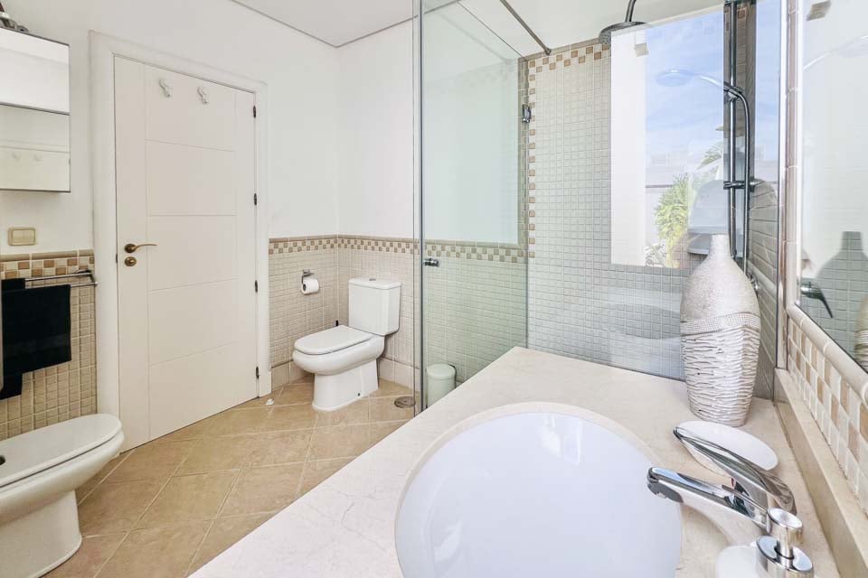 For at komme til villaen er der en sti, der er 250 cm bred. Hoveddøren har en bredde på 99 cm, mens døren til terrassen er 128 cm bred. Terrassen er åben, flad og flisebelagt. Der er et lille trin ned fra den skyggefulde terrasse til poolen, som det kan ses på billederne. Poolen har trinadgang. Dette er en ejendom i stueetagen. Alle soveværelser har en dørbredde på 70 cm, mens alle badeværelser har en dørbredde på 70 cm. Døren ind til køkken/alrum er 70 cm bred, og døren ind til opholdsstuen er også 70 cm bred. *Bemærk venligst, at selvom vi har gjort alt for at sikre, at de givne oplysninger er nøjagtige, kan der forekomme fejl, og hvis du har brug for mere specifik information om villaen, er du velkommen til at kontakte os.