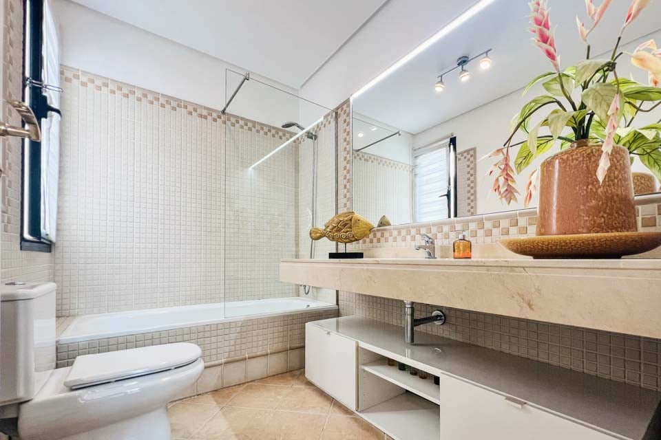Badekar med bruser, toilet, håndvask