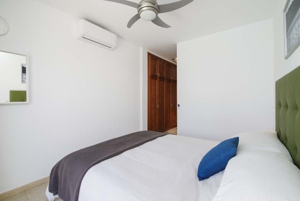 Kingsize-seng, loftsventilator, aircondition, terrassedøre