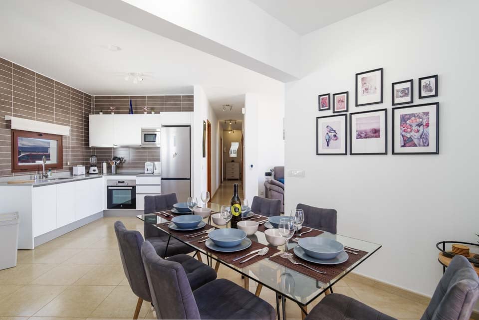 Indvendigt er villaen moderne med en åben stue og køkken med smart-tv og terrassedøre, der lukker masser af naturligt sollys ind. Der er tre soveværelser i stueetagen, alle med aircondition for din komfort. I stueetagen er der en overdækket adgang til en intern trappe, der fører til underetagen, hvor der er yderligere to soveværelser, også med aircondition, en anden stue, køkken og spisebord. Dette sted er ideelt for dem, der rejser i større grupper, og som ønsker lidt ekstra plads, mens de holder ferie med egen forplejning.