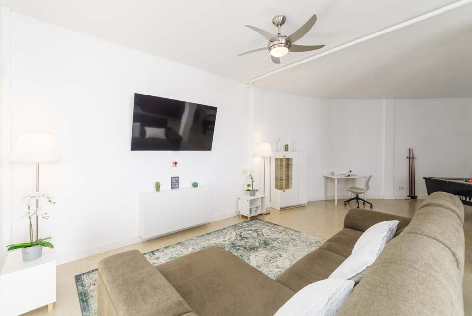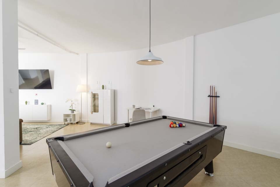 Åben planløsning, Tekøkken, Opvaskemaskine, Vaskemaskine, Spisefaciliteter, Komfortabelt siddeområde, Smart-tv, Billardbord