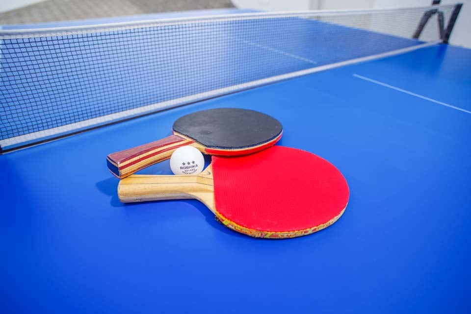 Åben terrasse, udendørs spiseplads, murstensgrill, liggestole, parasol, havemøbler, bordtennis, spabad