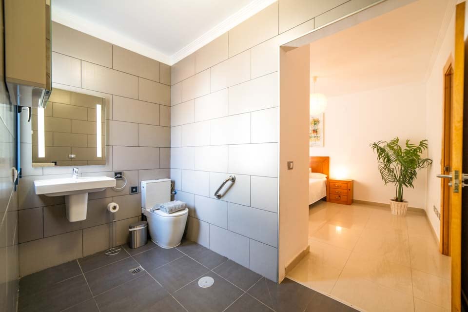 For at komme til villaen er der en 100 cm bred sti uden trin. Hoveddøren har en bredde på 130 cm. Døren, der fører til poolterrassen, er 130 cm bred, mens stien til poolområdet er 130 cm bred, langs en rampe. Terrassen omkring poolen er flad og flisebelagt. Selve poolen har trinadgang. Dette er en ejendom i stueetagen. Alle soveværelsesdøre har en bredde på 70 cm, mens det ensuite brusebad har en dørbredde på 70 cm. Døren ind til køkken/alrum er 115 cm bred, mens døren til stuen er 115 cm bred. *Bemærk venligst, at selvom vi har gjort alt for at sikre, at de givne oplysninger er nøjagtige, kan der forekomme fejl, og hvis du har brug for mere specifik information om villaen, er du velkommen til at kontakte os.