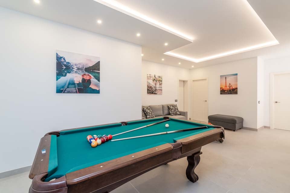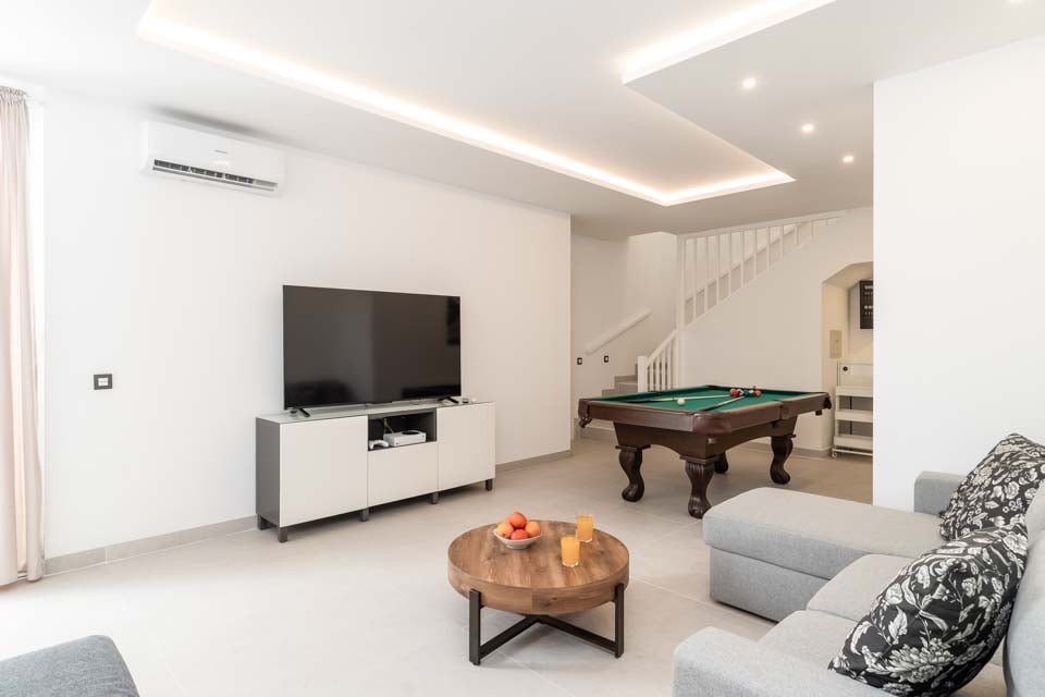 Komfortabelt siddeområde, poolbord, køleskab, smart-tv, spillekonsol