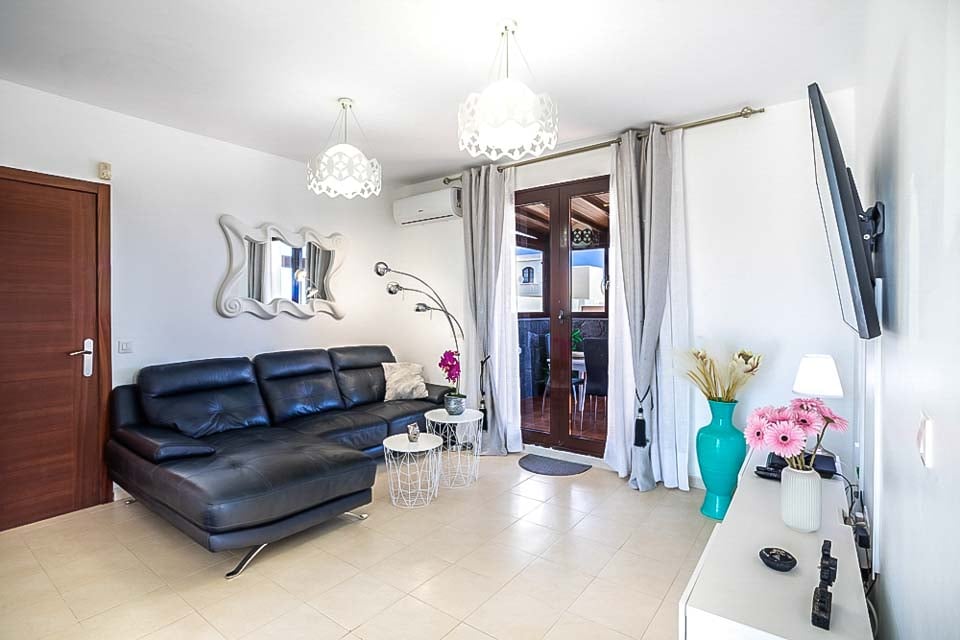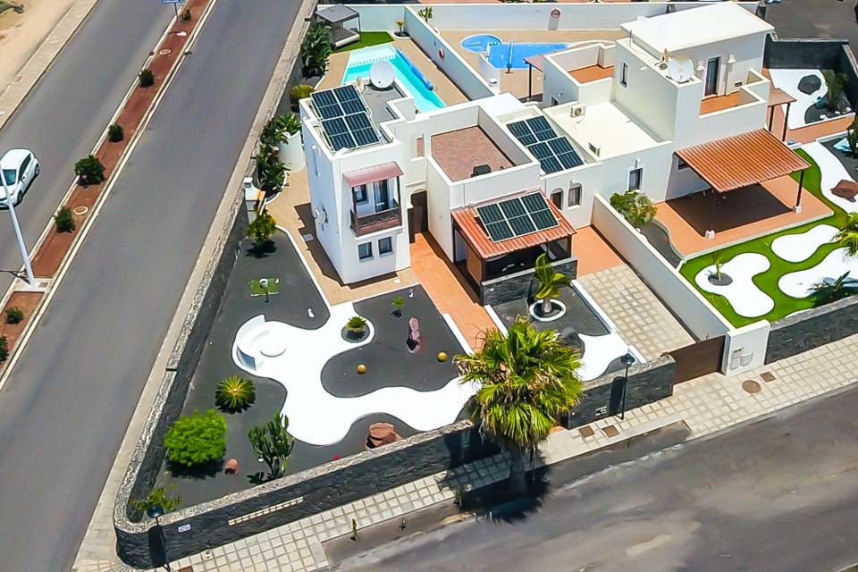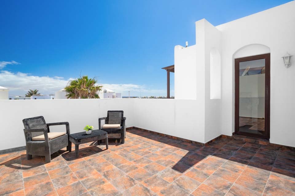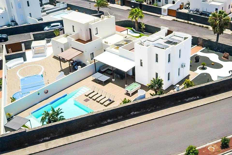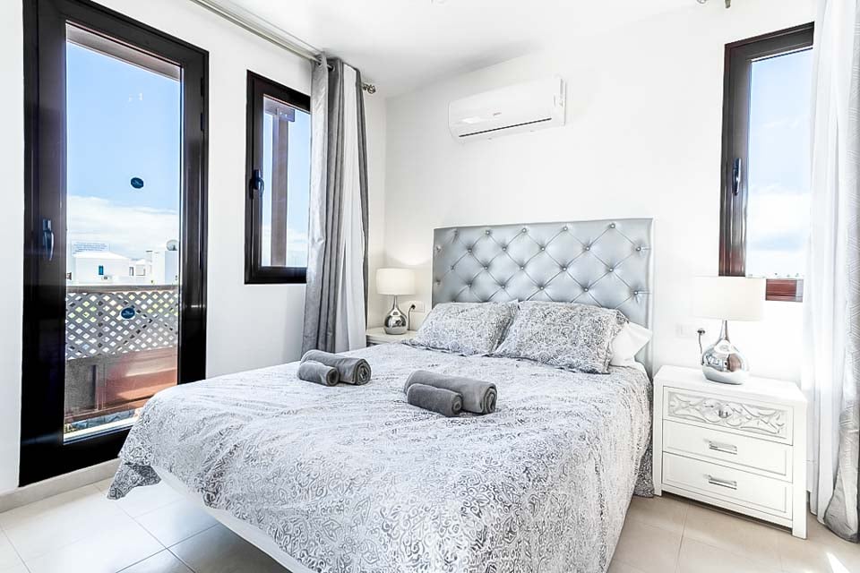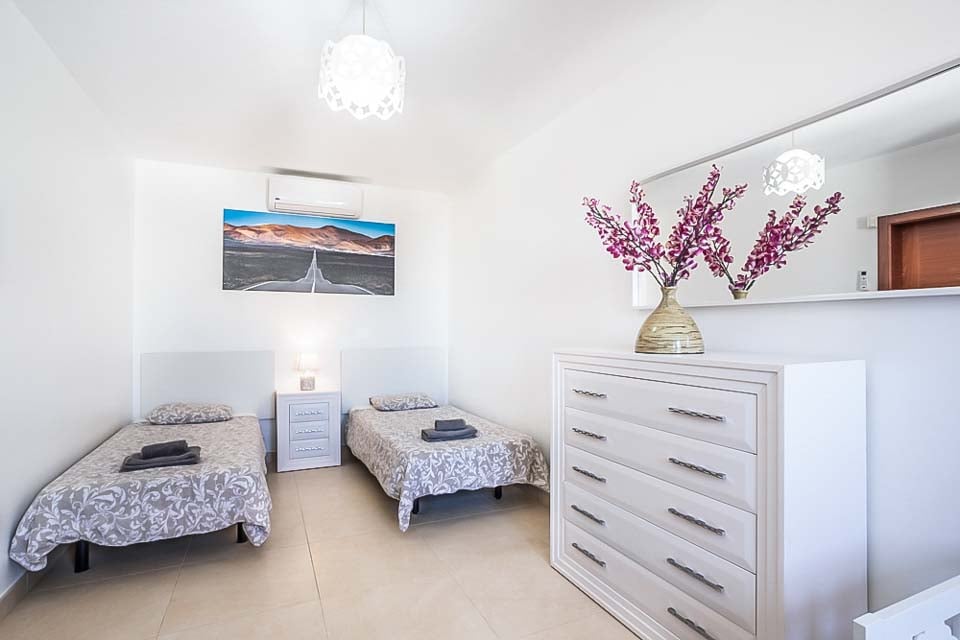 Villa Perla er en lys, moderne villa med omhyggeligt placeret moderne møbler af ejeren, der tilbyder Solmars gæster den ideelle villaferieoplevelse. Stueetagen er fordelt på to etager og består af en åben stue med spiseplads og et moderne, fuldt udstyret køkken, et soveværelse med to enkeltsenge og et soveværelse med dobbeltseng, der begge deler et familiebadeværelse. Ovenpå finder du endnu et soveværelse med dobbeltseng, eget badeværelse og en privat terrasse med udsigt over naboøen Fuerteventura. Alle soveværelser har aircondition for din komfort, og der er WiFi tilgængeligt i hele villaen.