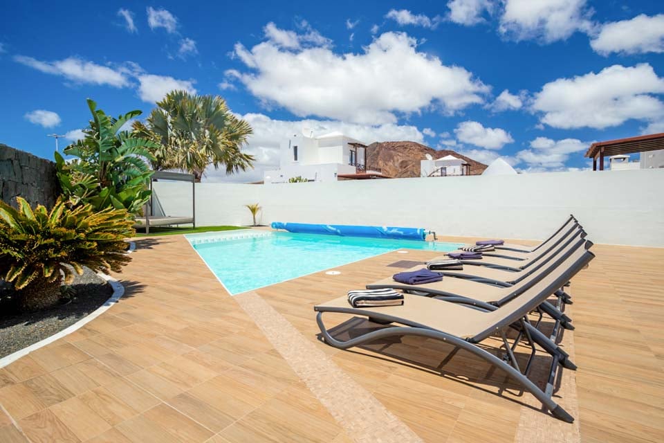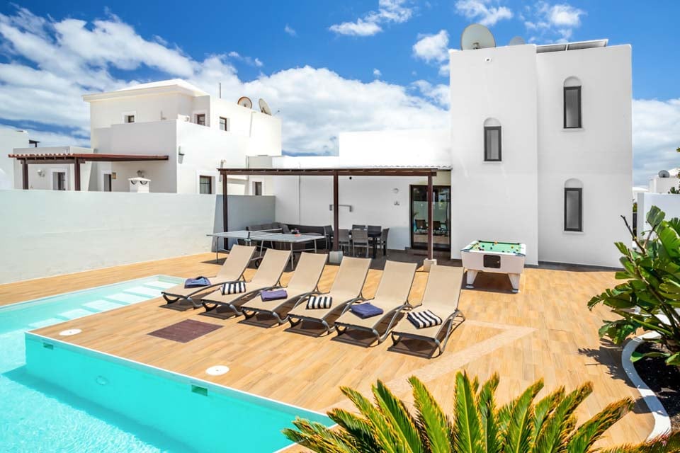 Terrassedøre fra opholdsstuen fører ud til dit udendørs opholdsområde, hvor der er to solsenge i hjørnet af grunden, og solsengene er perfekt placeret omkring din private fritformede swimmingpool (opvarmning inkluderet mellem november og april) med en separat lavere sektion adskilt af søjler. En pergola er placeret ved siden af villaen, hvilket giver ekstra skygge for dem, der ønsker at undslippe det kanariske solskin, og villaen er også udstyret med et poolbord og bordtennisbord, som familie og venner kan nyde under hele jeres ferie.