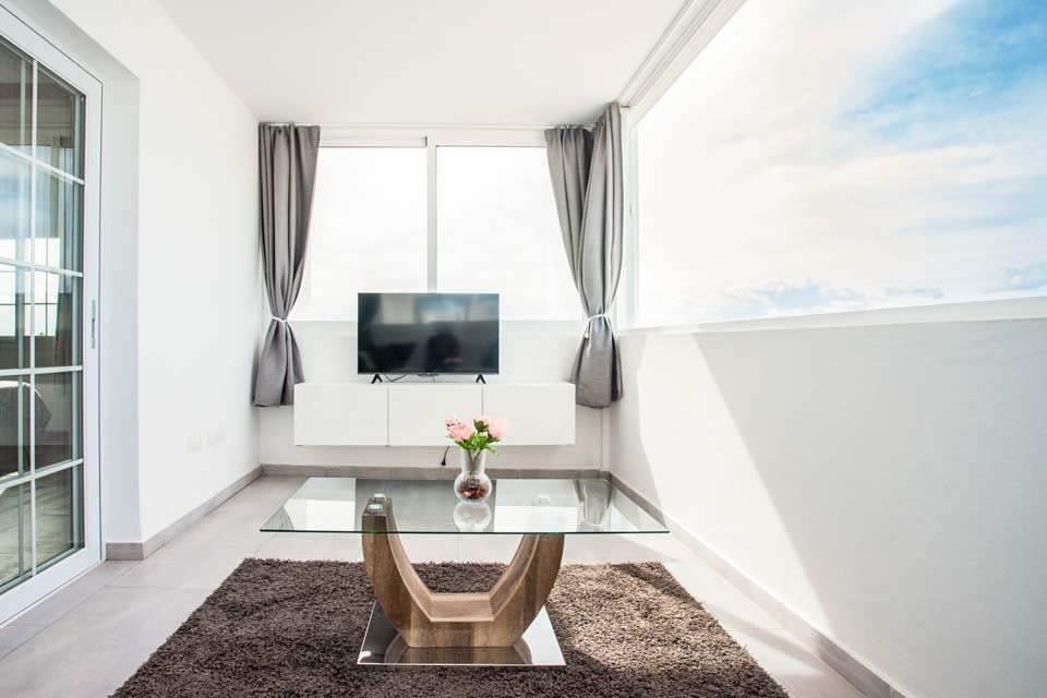 Komfortabelt siddeområde, aircondition, smart-tv, døre til terrasse
