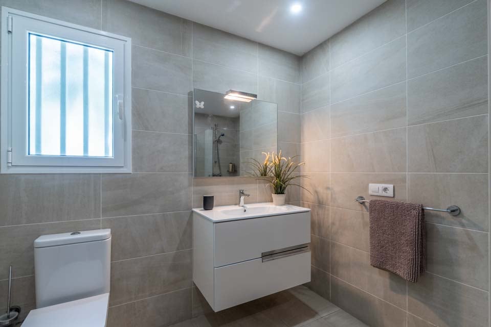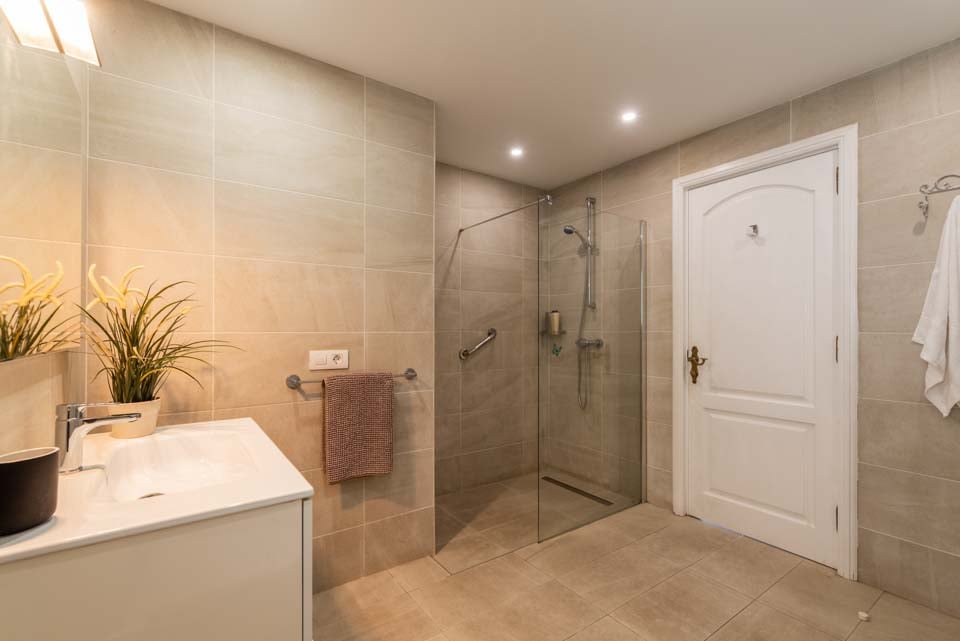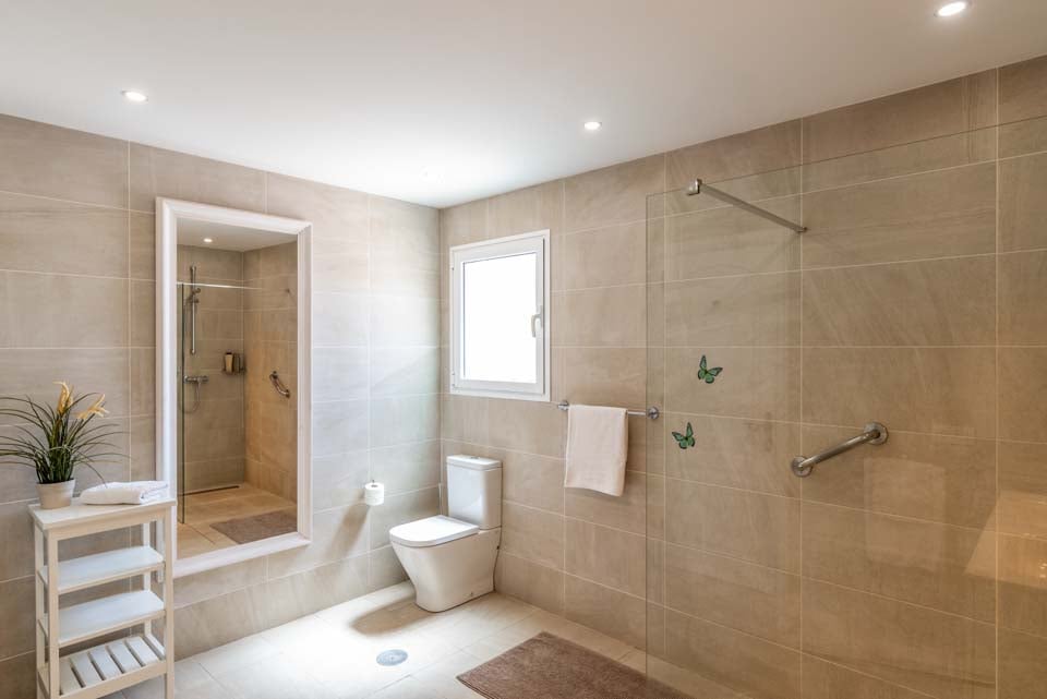 For at komme til villaen er der en sti, der er 80 cm bred. Hoveddøren har en bredde på 80 cm, mens døren til terrassen er 160 cm bred. Der er et lille trin ned fra terrassedørene til terrassen, og et trin ned fra den skyggefulde spiseplads til terrassen. Poolkanten er flad og flisebelagt. Selve poolen har trinadgang. Dette er en ejendom i stueetagen. Alle soveværelser har en dørbredde på 72 cm, mens alle badeværelser har en dørbredde på 72 cm. Døren ind til køkken/alrum er 80 cm bred, og døren ind til opholdsstuen er også 80 cm bred. *Bemærk venligst, at selvom vi har gjort alt for at sikre, at de givne oplysninger er nøjagtige, kan der forekomme fejl, og hvis du har brug for mere specifik information om villaen, er du velkommen til at kontakte os.