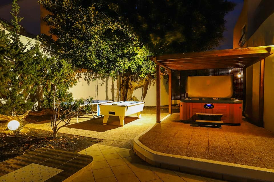 Billardbord, Spabad, Overdækket terrasse, Udendørs servering, Udendørs spisemuligheder, Spisefaciliteter, Liggestole, Grill, Murstensgrill, Bordtennis