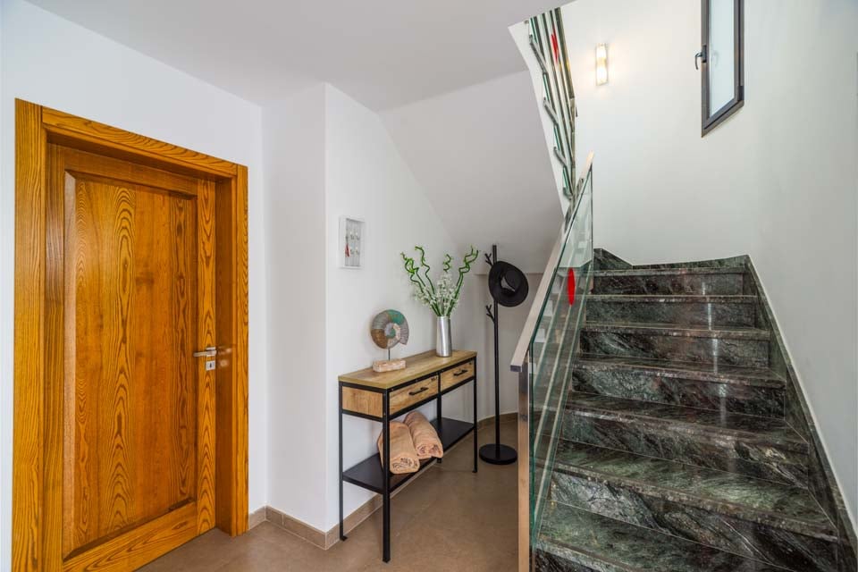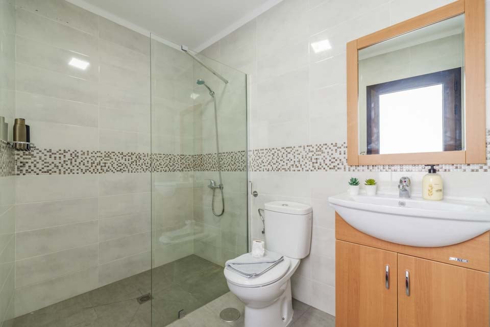 Bemærk venligst, at denne villa ligger i et bakket område. Villaen ligger på en bakke inde i feriestedet. For at komme til villaen er der en sti, der er 200 cm bred. Hoveddøren har en bredde på 78 cm, mens døren til terrassen er 200 cm bred. Udendørsområdet er fladt og flisebelagt, mens selve poolen har trinadgang med et gelænder til støtte. Der er ingen soveværelser i stueetagen. Der er 16 trin til første sal, hvor dørene til soveværelset med to enkeltsenge og brusebadet er 72 cm brede. Døren ind til køkken/alrum er 74 cm bred, og døren ind til opholdsstuen er også 74 cm bred. *Bemærk venligst, at selvom vi har gjort alt for at sikre, at de givne oplysninger er nøjagtige, kan der forekomme fejl, og hvis du har brug for mere specifik information om villaen, er du velkommen til at kontakte os.