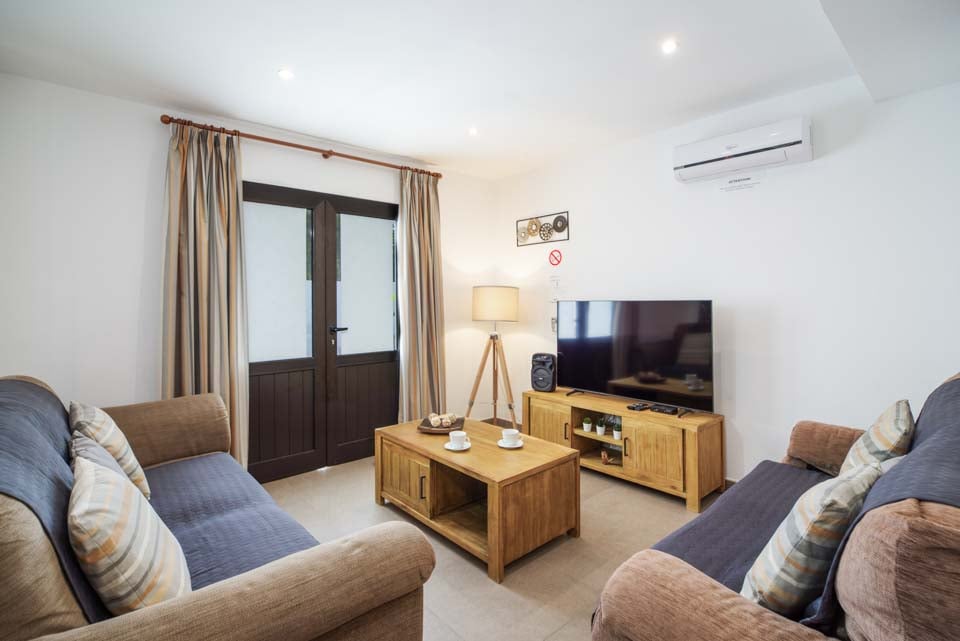 Komfortabelt siddeområde, Smart-tv, aircondition, spiseplads, døre til terrasse