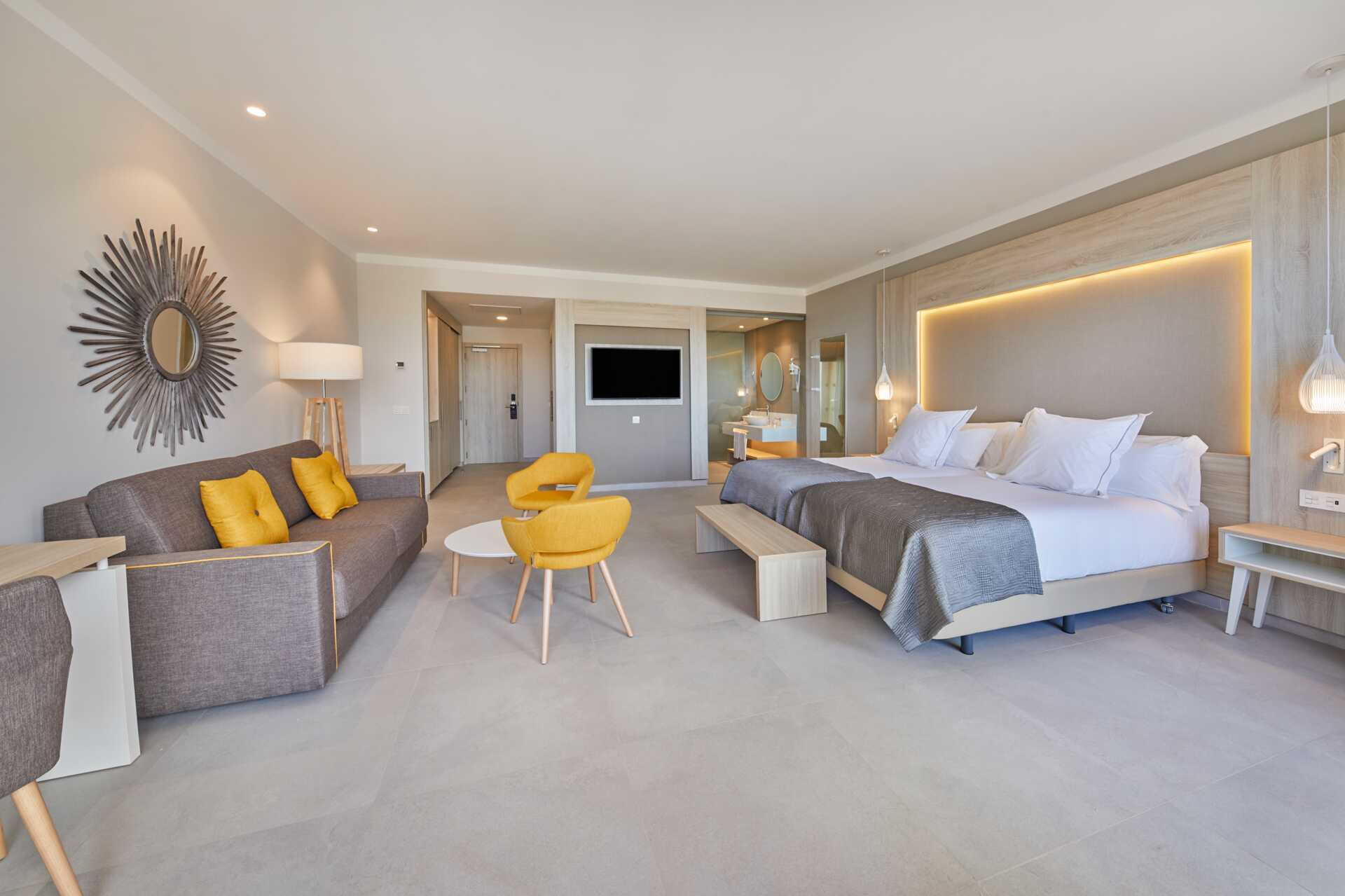 Junior-suiter med balkon eller terrasse, nogle med delvis havudsigt. En dobbeltseng eller to enkeltsenge. Mulighed for ekstra opredning i sovesofa. Gratis wifi, aircondition og deponering. Minibar mod betaling. El-kedel og kaffe/te. Tv med internationale kanaler. Hårtørrer. Badeværelse med bruser og toilet. Rengøring 7 gange om ugen.