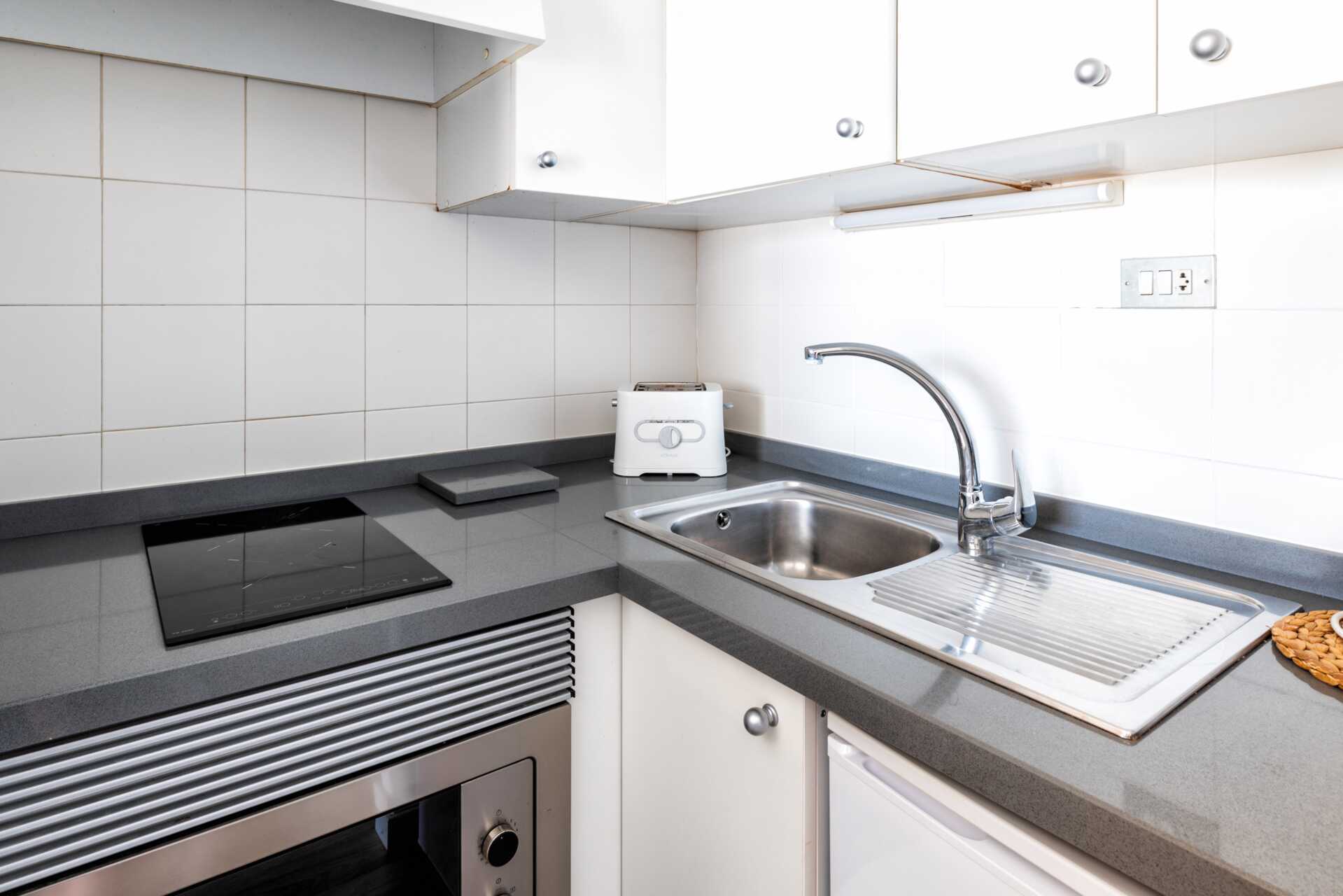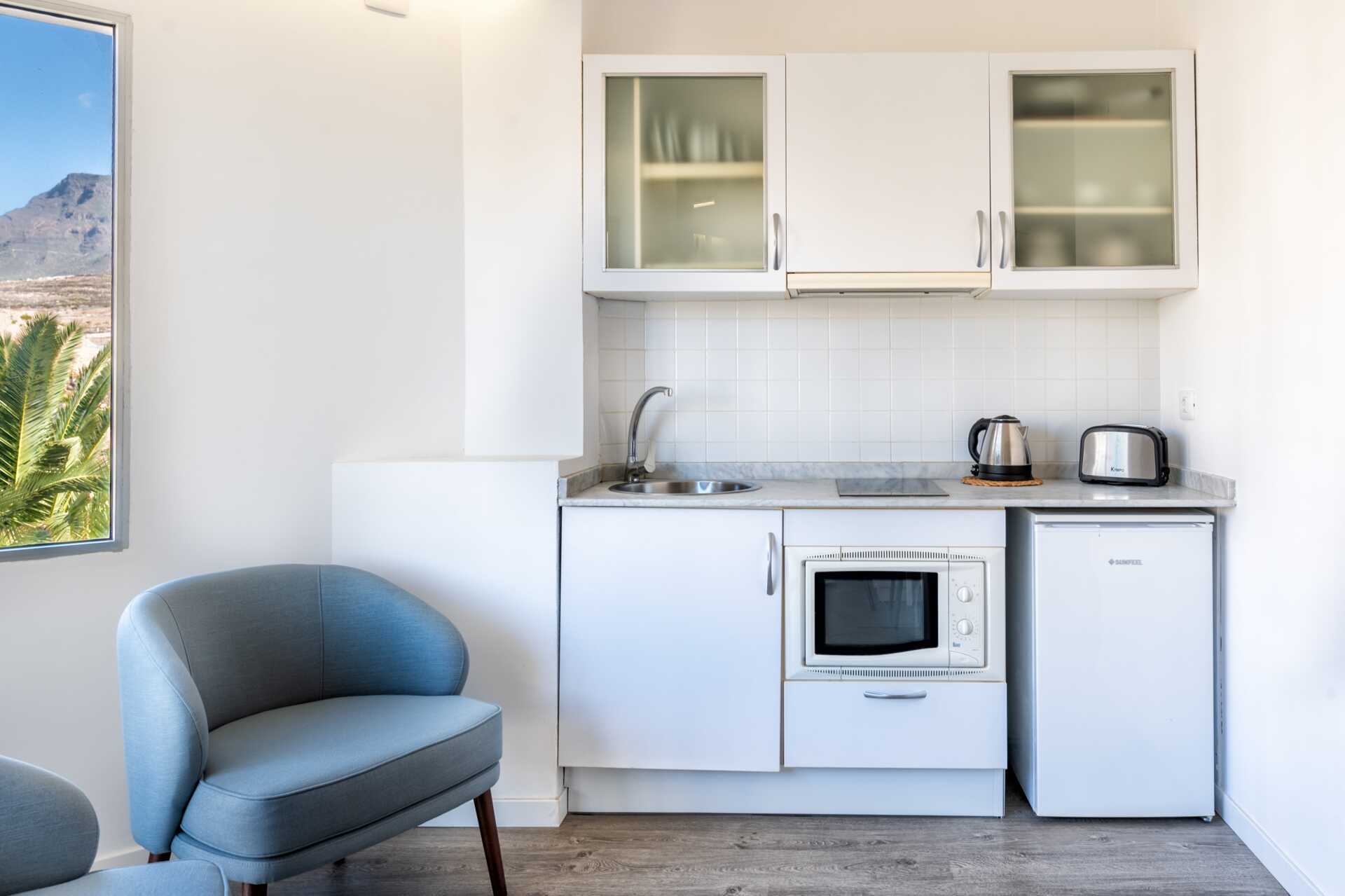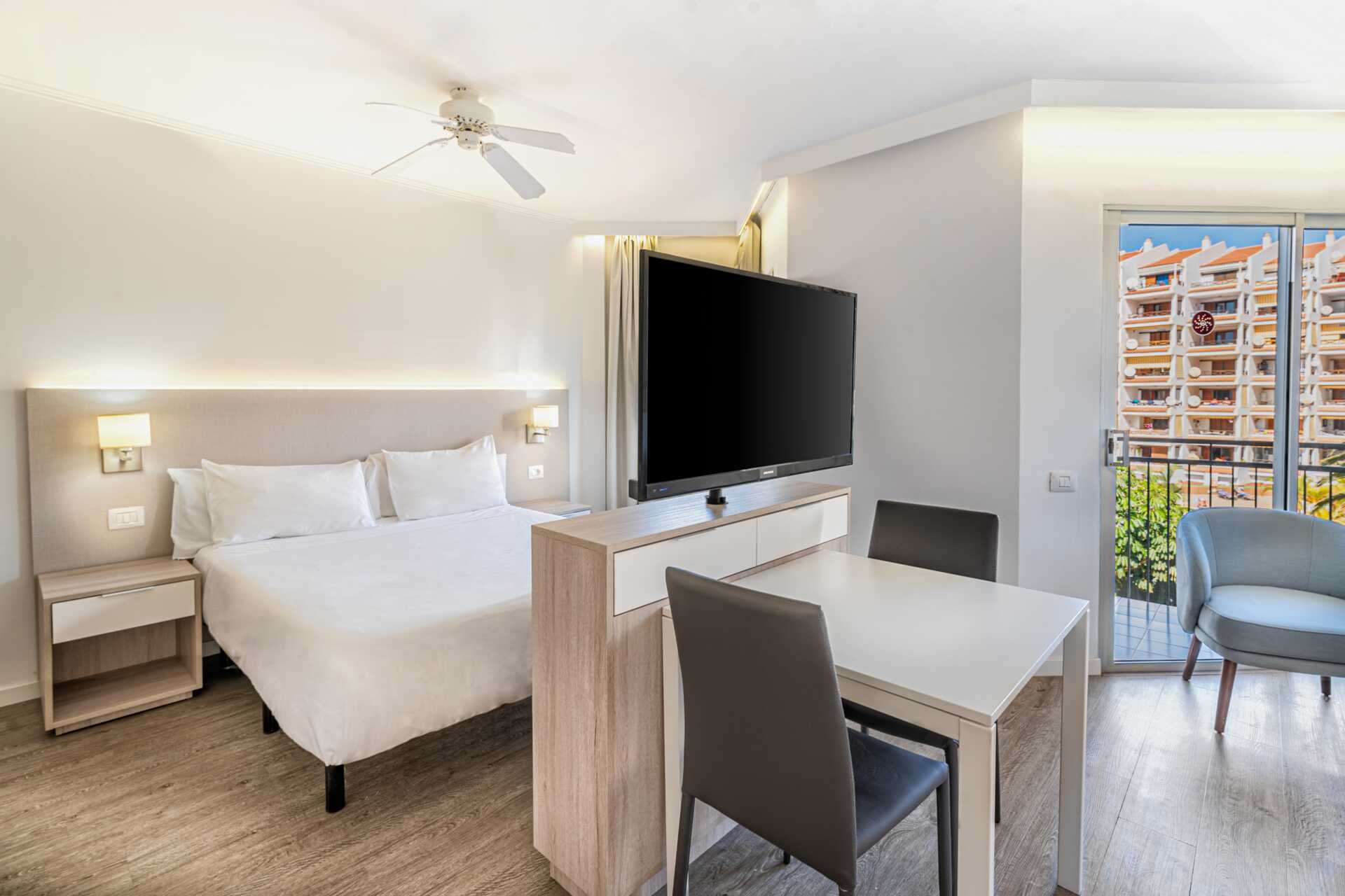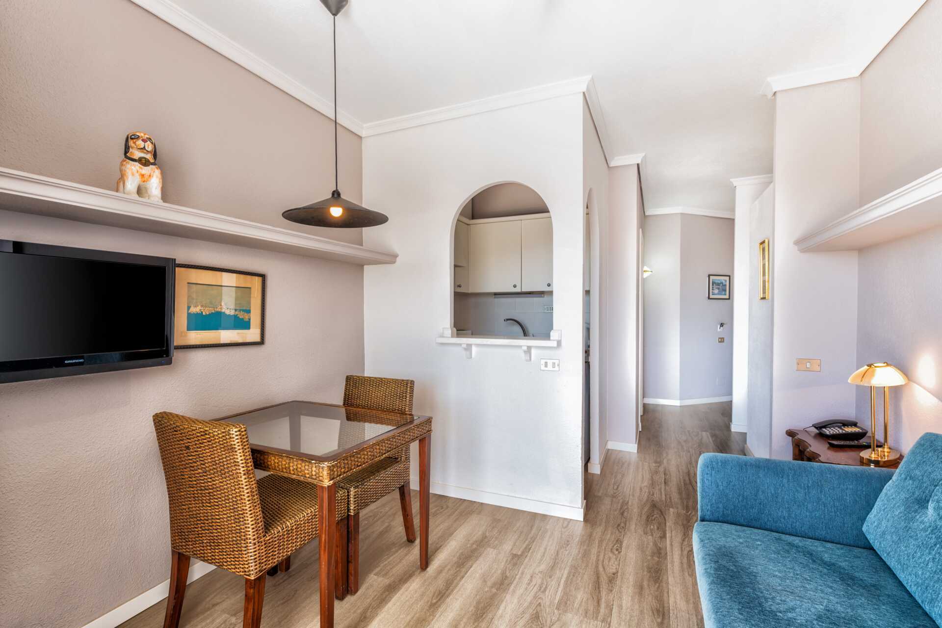 1-værelses lejlighed med balkon eller terrasse og pooludsigt. Lejlighederne er beliggende i en seks-etagers bygning med elevator. Soveværelse kombineret med minikøkken. En dobbeltseng eller to enkeltsenge. Minikøkken med køleskab, kogeplader, kombineret ovn og mikroovn, el-kedel, brødrister og enkelt køkkenudstyr. Wifi og deponering mod betaling. Der er en loftsventilator i soveværelset. Tv med internationale kanaler. Hårtørrer. Badeværelse med badekar eller bruser samt toilet. Rengøring 5 gange om ugen.