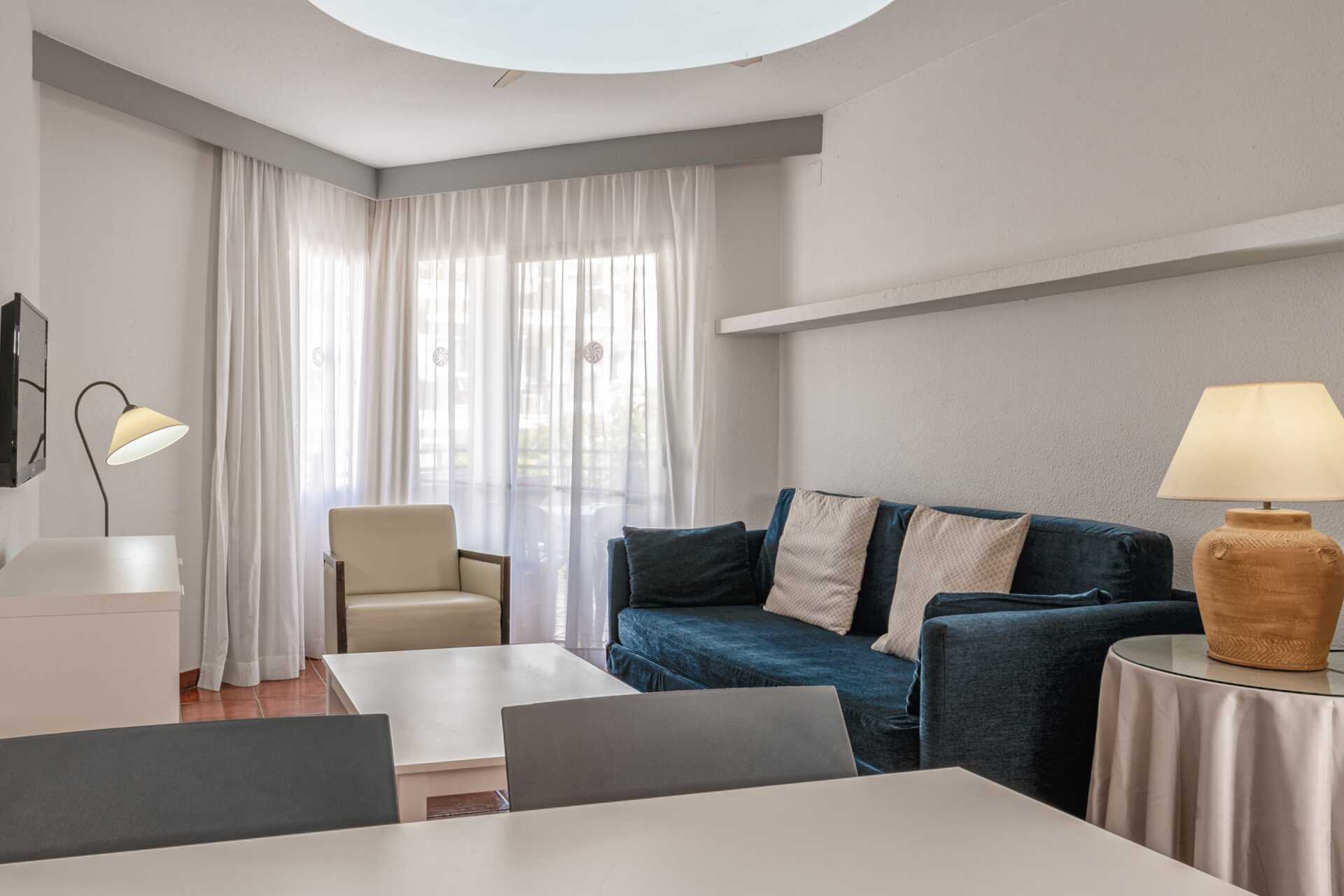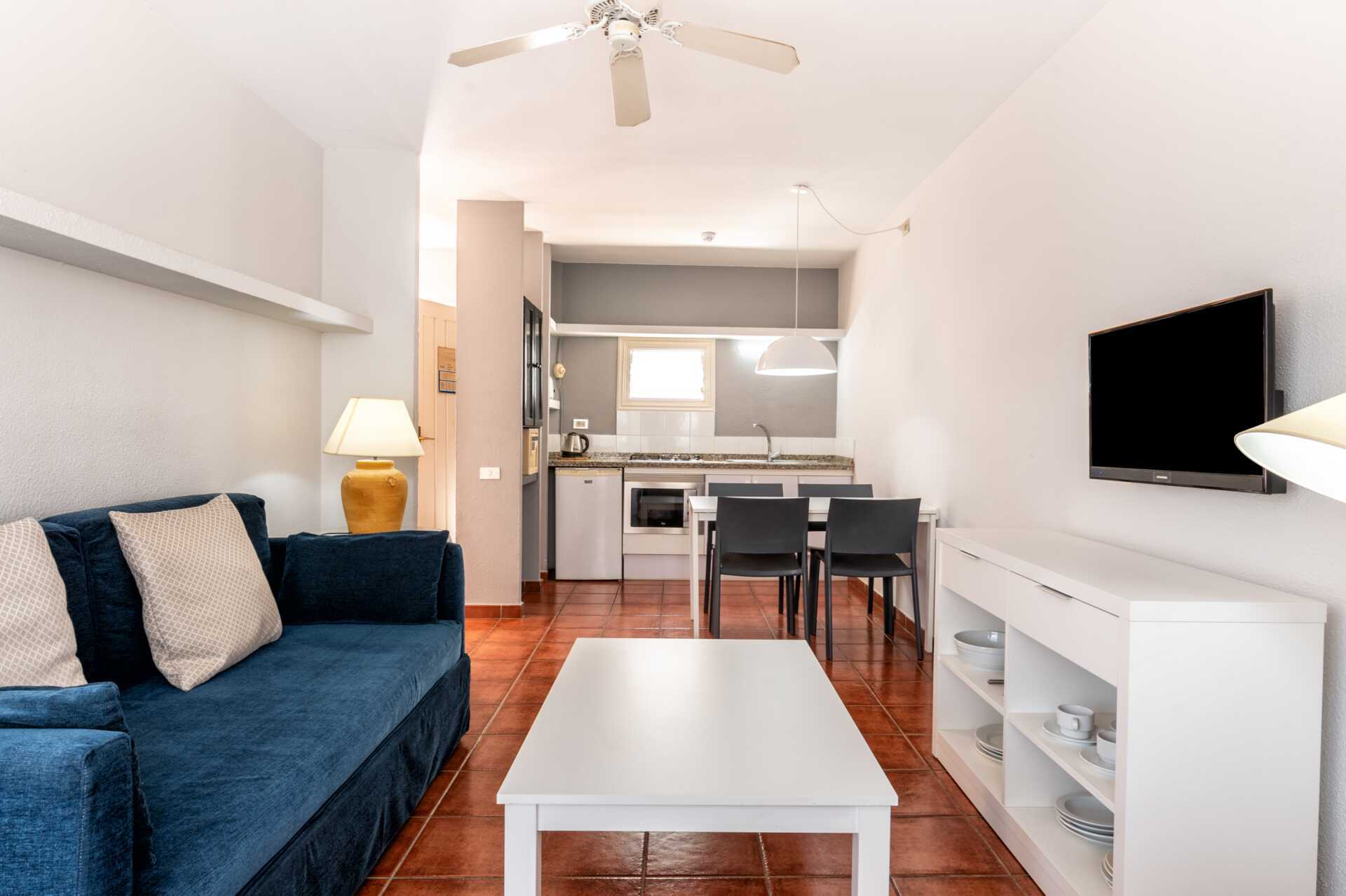 Lidt slidte 2-værelseslejligheder med balkon eller terrasse, nogle med pooludsigt. Soveværelse og kombineret opholdsrum med minikøkken. En dobbeltseng eller to enkeltsenge. Mulighed for ekstra opredninger i sovesofa. Minikøkken med køleskab, kogeplader, ovn, el-kedel, brødrister og enkelt køkkenudstyr. Wifi og deponering mod betaling. Loftsvifte i opholdsrummet. Tv med internationale kanaler. Hårtørrer. Badeværelse med badekar eller bruser samt toilet. Rengøring 5 gange om ugen.