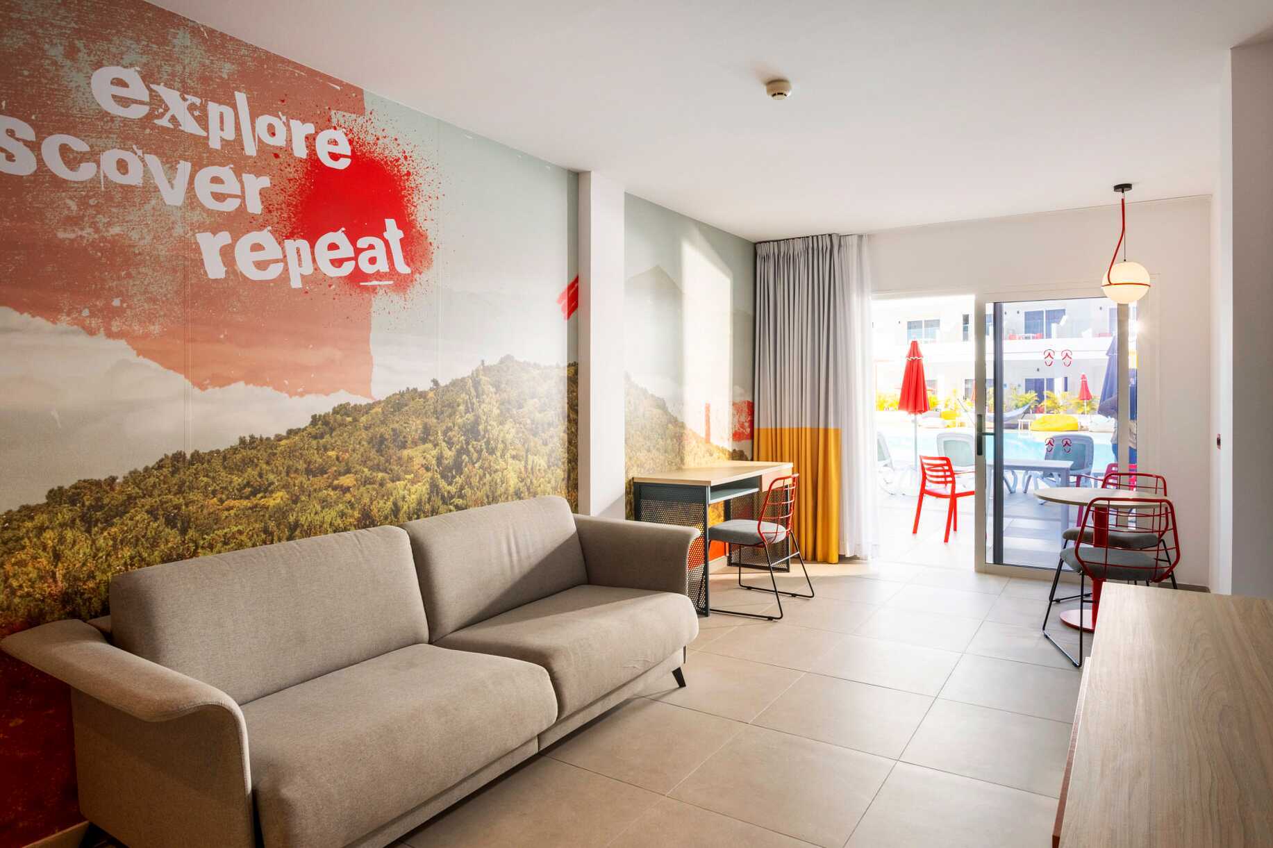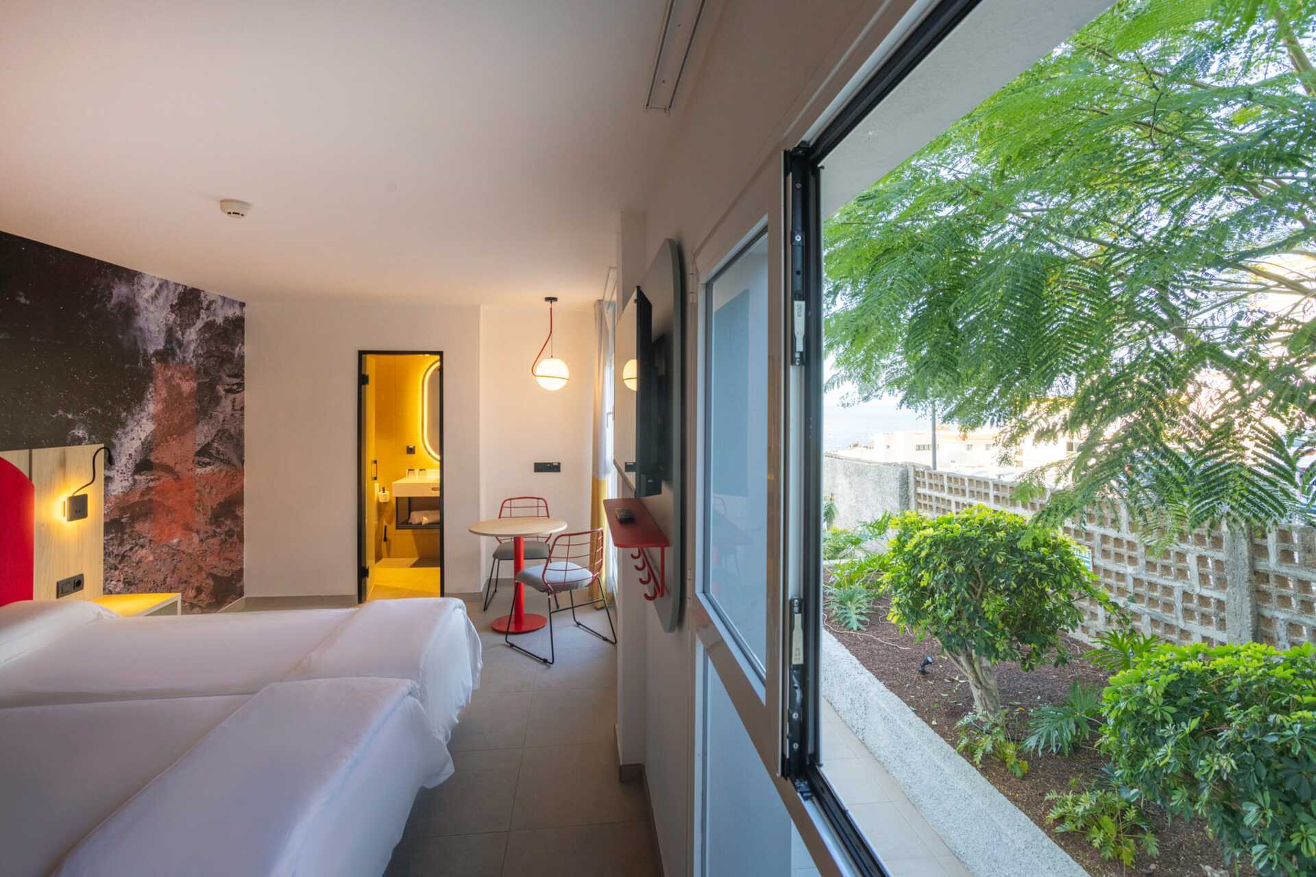 Suite med terrasse i stueplan og pooludsigt. Suiten består af et soveværelse og et opholdsrum. To enkeltsenge. Mulighed for en ekstra opredning i sovesofa. Gratis wifi, aircondition og deponering. Loftsvifte. Minibar. Tv med internationale kanaler. Badeværelse med bruser og toilet. Rengøring hver tredje dag.