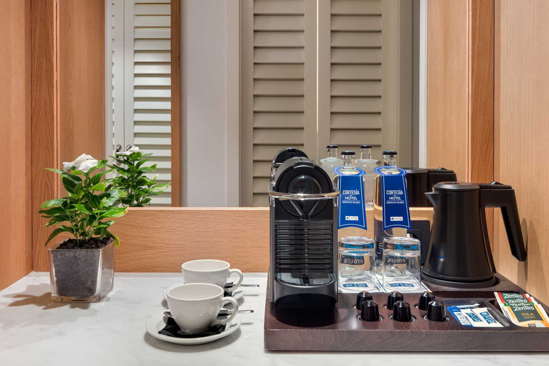 Deluxe-værelser med balkon. Deluxe-værelser er såkaldte privilegerede værelser med ekstra fordele. En dobbeltseng eller to enkeltsenge. Mulighed for en ekstra opredning i sovesofaen. Pudemenu. Gratis wifi, aircondition og deponering. Loftsvifte. Minibar - genopfyldes hver anden dag. Nespresso-maskine - kapsler inkluderet og genopfyldes dagligt. El-kedel. Tv med internationale kanaler og Chromecast. Badekåber og tøfler. Eksklusive poolhåndklæder. Hårtørrer. Badeværelse med bruser og toilet. Rengøring 5 gange om ugen.