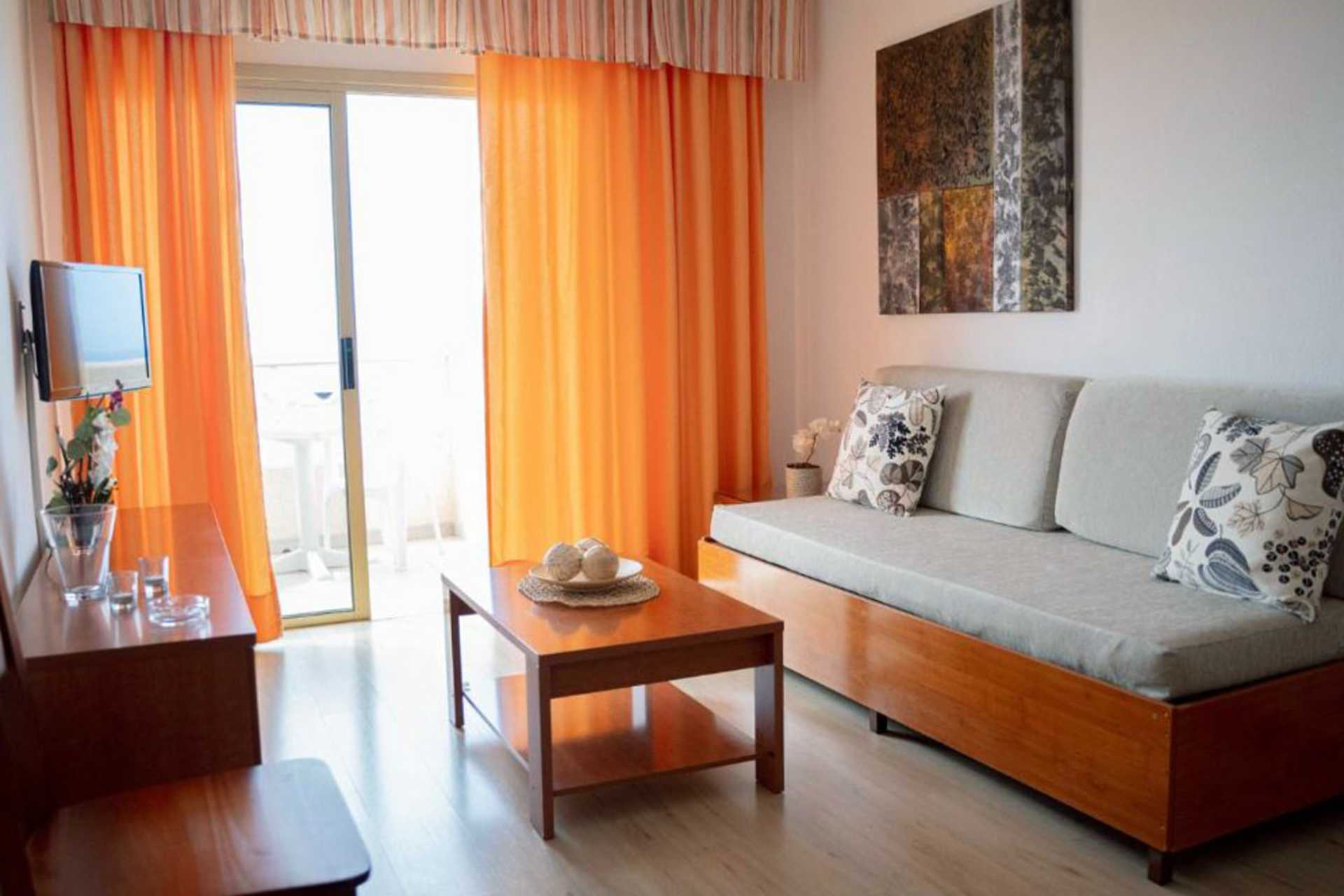 2-værelses lejlighed med balkon, nogle med delvis havudsigt eller med pooludsigt. Cava, nødder og tørret frugt på værelset ved ankomst. Soveværelse og kombineret opholdsrum med minikøkken. To enkeltsenge. Mulighed for ekstra opredning i sovesofa. Minikøkken med kogeplader, køleskab, mikrobølgeovn, el-kedel og enkelt køkkenudstyr. Gratis wifi. Deponering mod betaling. Tv med internationale kanaler. Hårtørrer. Badeværelse med bruser og toilet. Rengøring 5 gange om ugen.