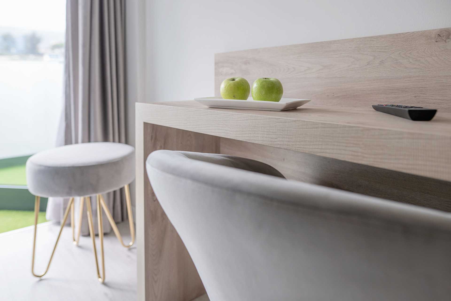 Junior-suiter med balkon. Et soveværelse med to enkeltsenge. Et opholdsrum med sofa og mulighed for ekstra opredning til to personer. Gratis wifi, aircondition og deponering. Minibar. El-kedel. Tv med internationale kanaler. Hårtørrer. Åben planløsning til badeværelse med badekar samt matterede glasdøre bruser og toilet. Rengøring 7 gange om ugen.