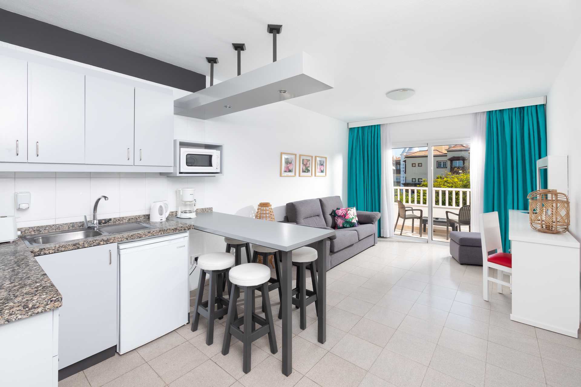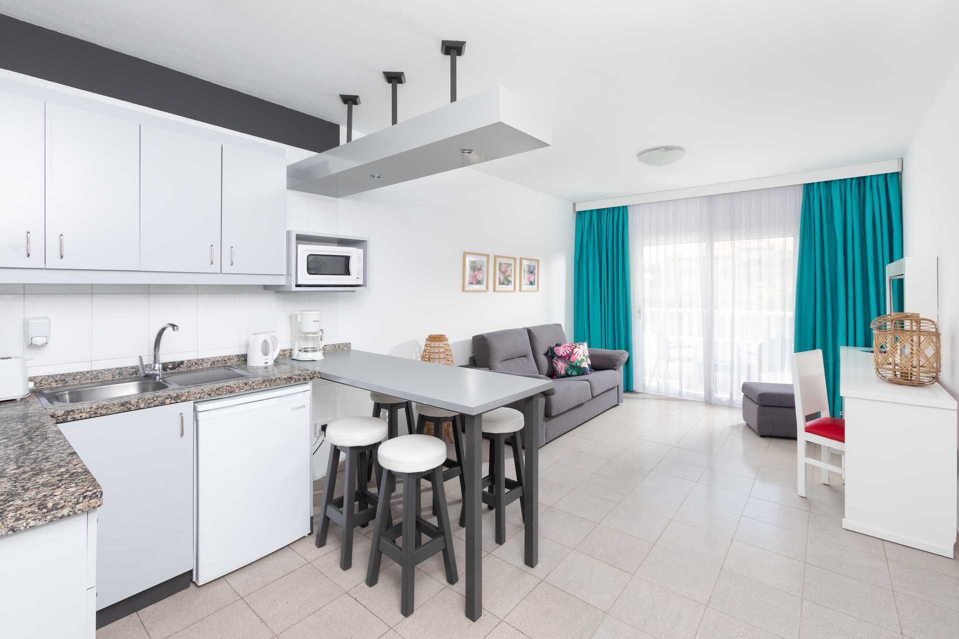 2-værelses lejligheder med balkon. Soveværelse og kombineret opholdsrum med minikøkken. En dobbeltseng og en dobbeltseng eller to enkeltsenge. Mulighed for ekstra opredning i sovesofa. Minikøkken med kogeplader, køleskab, mikroovn, brødrister. kaffemaskine og enkelt køkkenudstyr. Spiseplads ved bardisk. Gratis wifi. Deponering mod depositum og betaling. Tv med internationale kanaler. Hårtørrer. Badeværelse med bruser og toilet. Rengøring 5 gange om ugen.