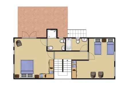 Der er et andet soveværelse med dobbeltseng, som er smukt indrettet, og endelig et dejligt rummeligt værelse med to enkeltsenge. Alle værelser har den velkomne aircondition.