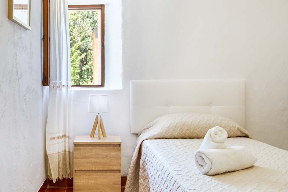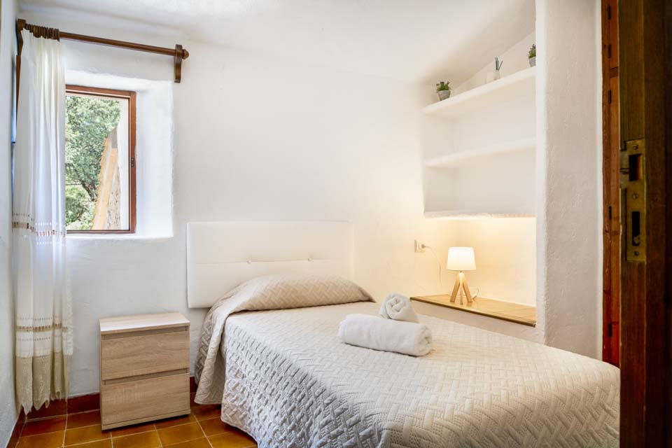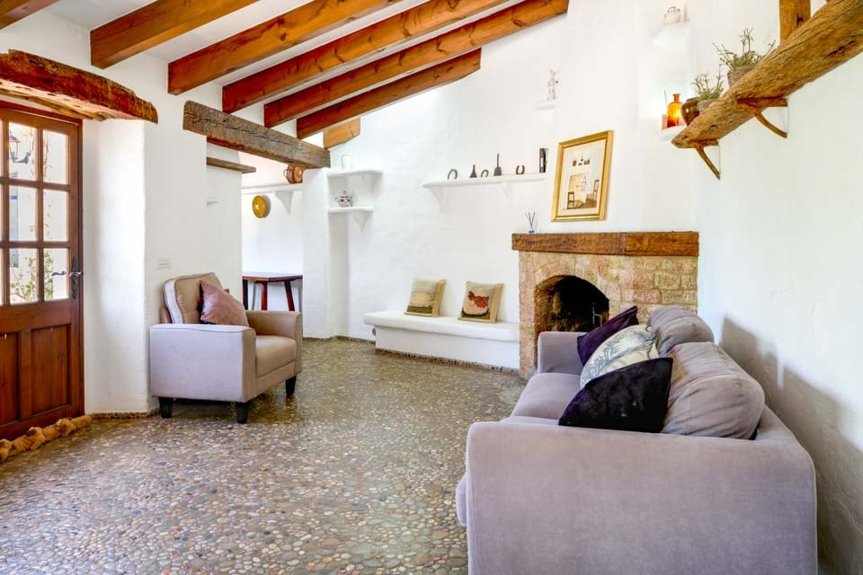 Det er et godt eksempel på, hvordan man kan kombinere traditionel arkitektur med moderne faciliteter. Huset har bevaret sit originale stengulv i stuen/spisestuen, men er møbleret med komfortable, moderne sofaer og et smart-tv samt en original åben pejs til brug i den tidlige og sene sæson. Det fuldt udstyrede køkken ligger ved siden af. Fra opholdsstuen er der en trappe, der fører ned til soveværelset med dobbeltseng, aircondition og fælles brusebad. Et par trin fører derefter op til soveværelset med to enkeltsenge og aircondition og soveværelset med enkeltseng og ventilator. Der er et andet brusebad med adgang udefra.