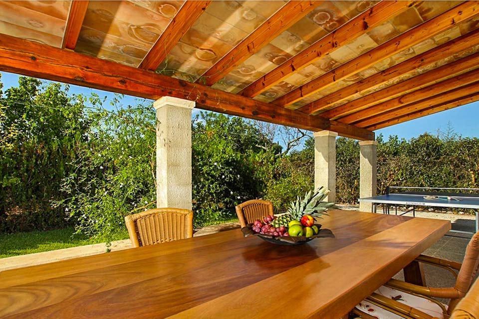 Du har dog måske ikke lyst til at forlade Can Rei Villa. Terrassen og haverne er et ideelt sted at slappe af og koble fra, med en liggestol til hver gæst og et udendørs køkkenområde. Med en murstensgrill, vask og spiseplads i bænkestil er dette område ideelt til udendørs spisning. Tilbered noget frisk fisk på grillen mellem et spil bordtennis.