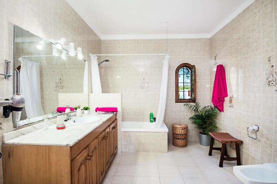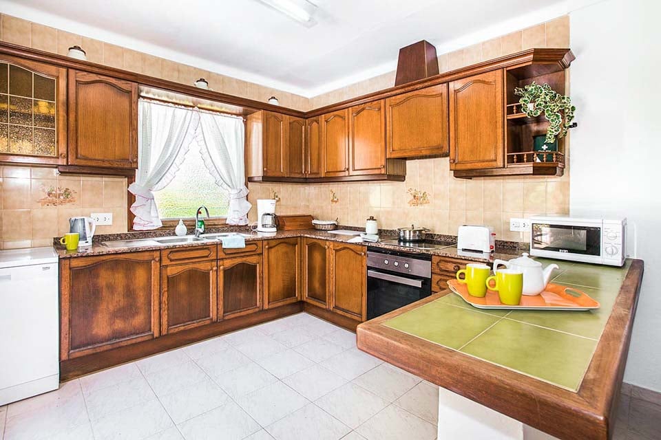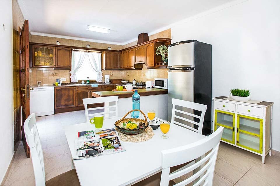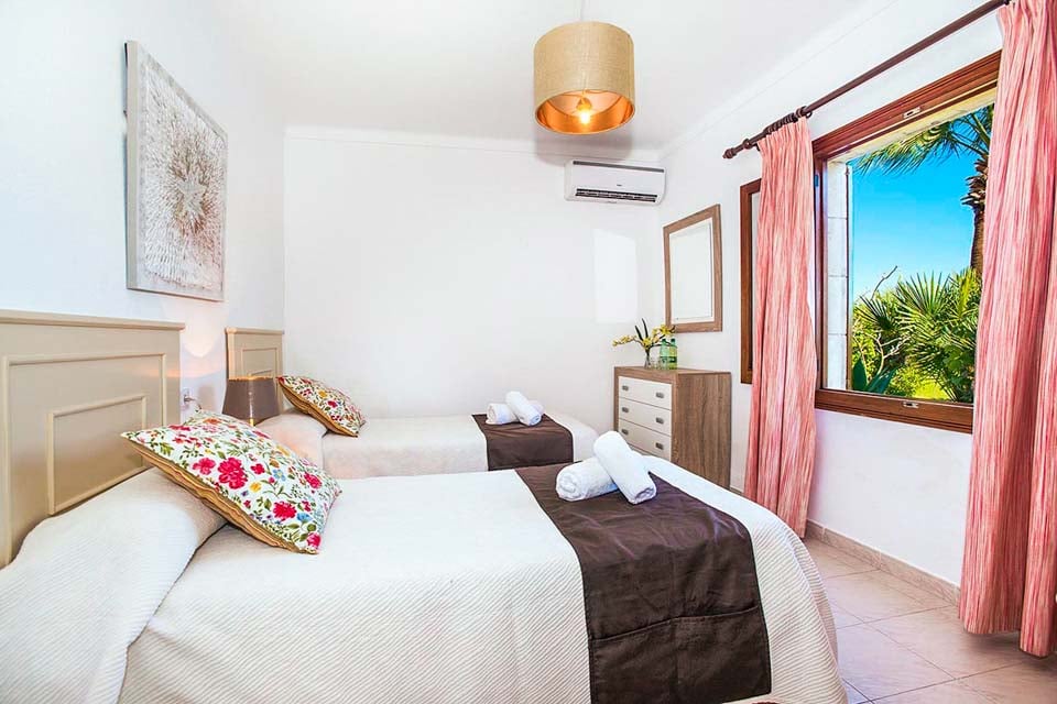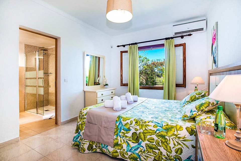 Indvendigt er Villa Geranios i ét plan. Et åbent opholds- og spiseområde har komfortable siddepladser, fladskærms-tv og dvd-afspiller. En buet trædør fører dig til den overdækkede terrasse og haven. Fra stuen finder du et traditionelt mørkt trækøkken, fuldt udstyret med spisebord, opvaskemaskine og et højt køleskab med fryser. Fortsætter vi gennem ejendommen, finder vi det første soveværelse, et soveværelse med dobbeltseng, aircondition og et stort badeværelse med bruser. De resterende to soveværelser er begge tvillingeværelser og deler et separat familiebadeværelse. Alle værelser har gratis tidsindstillet aircondition.