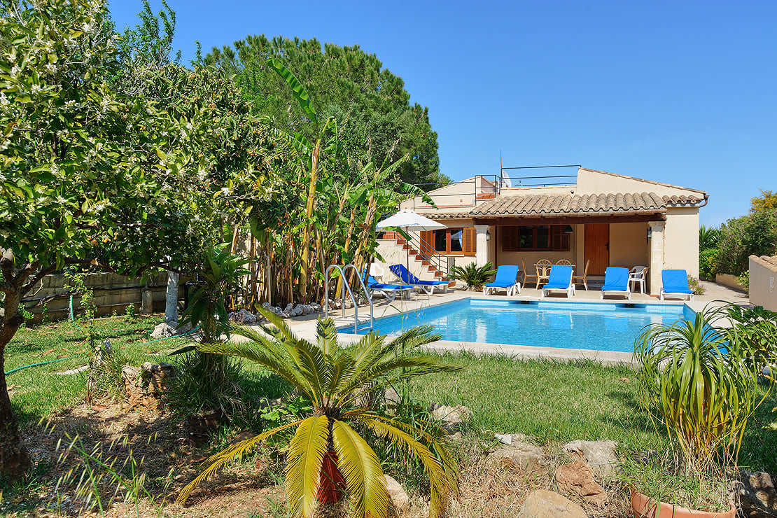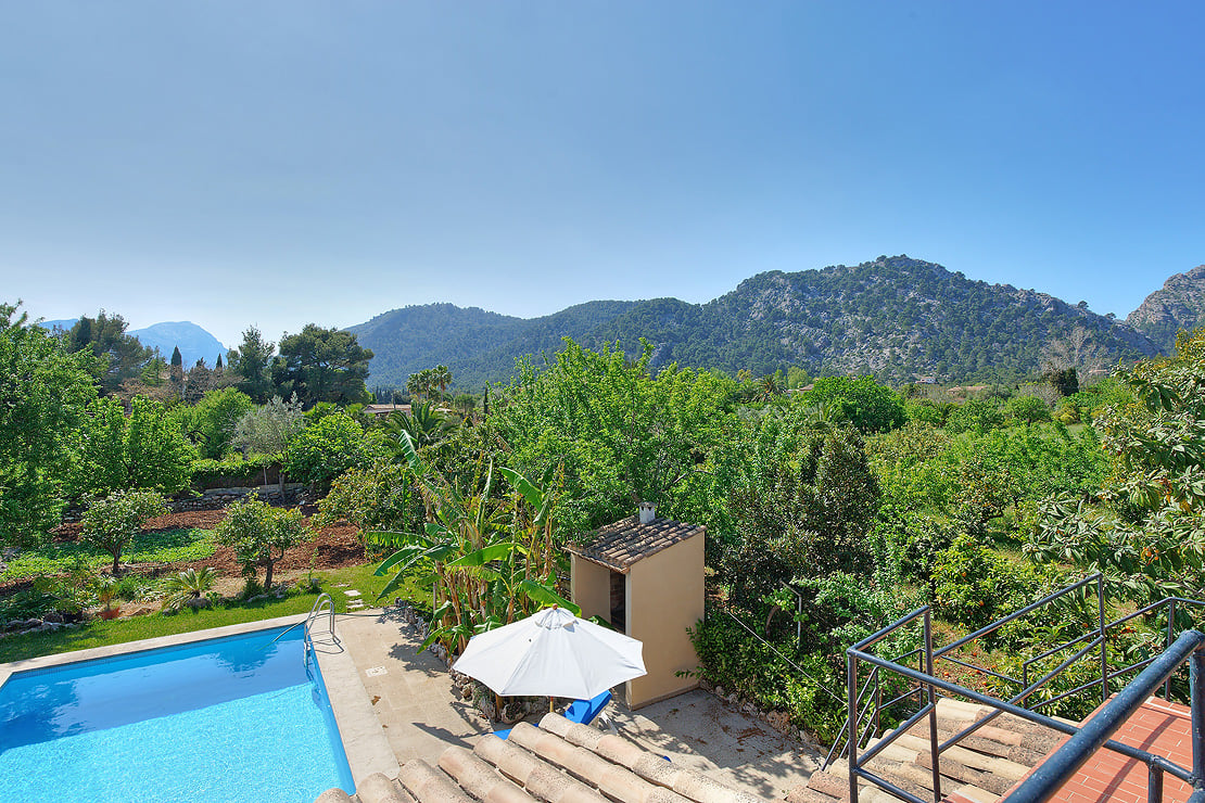 Swimmingpoolen har stor tiltrækningskraft her, et sted at køle af fra middagssolen. Frodigt løv kantes langs poolen, og liggestole venter på at blive afslappede. Der er også et udendørs spiseområde, det perfekte sted at nyde pa'amb oli, et mallorcansk brød med hvidløg, tomat og olivenolie.