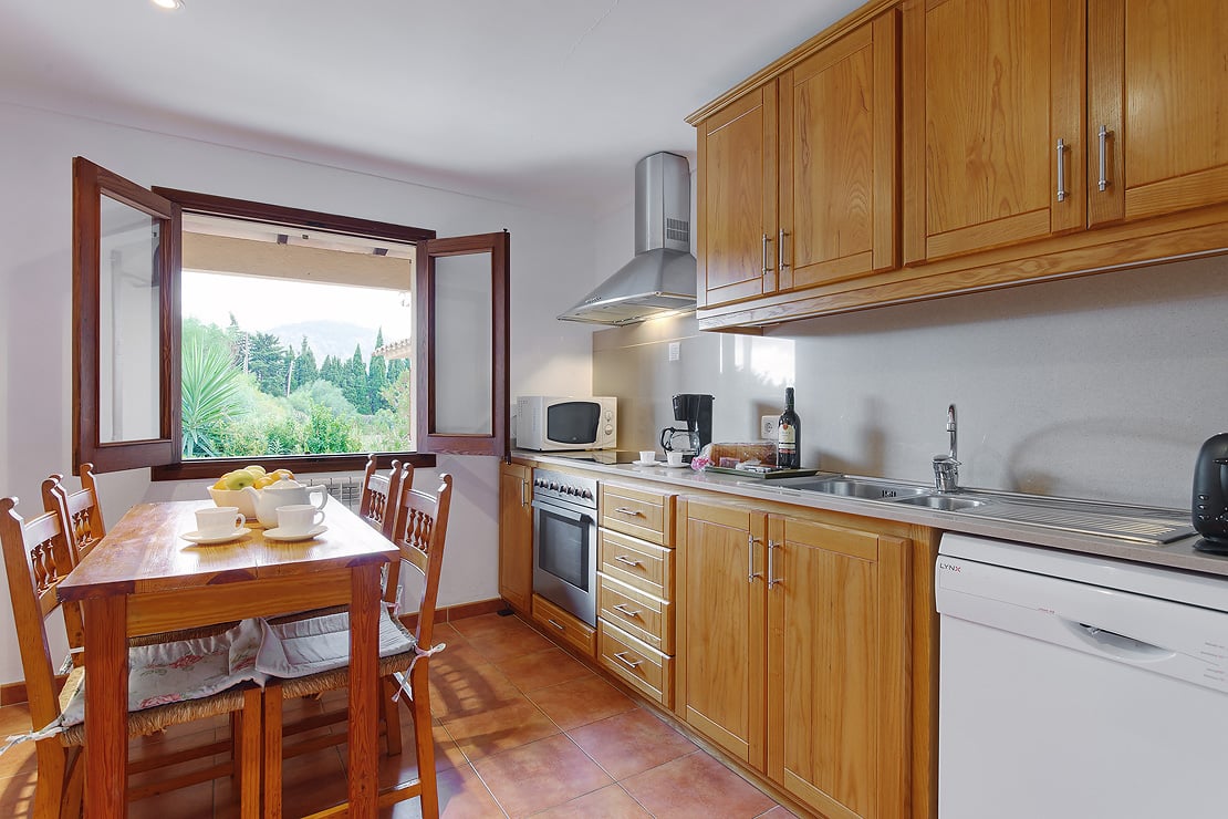 Indvendigt ligner villaen et traditionelt mallorcansk hjem med træmøbler og spanske tallerkener på væggene. Indretningen er hvid, gulvfliserne er terrakotta, og sengetøjet er naturligt. Med tre soveværelser kan villaen huse op til seks gæster.