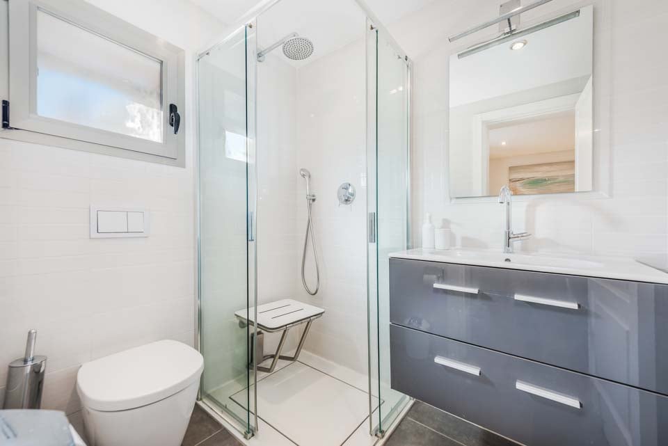 For at få adgang til villaen er der en bred sti samt 1 trin op til selve villaen. Hoveddøren har en bredde på 85 cm, og andre døre, der fører til poolområdet, er terrassedørene, som hver er 90 cm brede. Stierne fra villaen til poolen er 120 cm brede, jorden er flad, men der er en lille fordybning mellem belægningsstenene, og poolen har romerske trin for at komme ind. Den bredeste soveværelsesdør i stueetagen er 80 cm bred, hvilket er soveværelset, og den bredeste badeværelsesdør i stueetagen er 80 cm bred, hvilket er badeværelset. Døren ind til køkken/alrum er 100 cm bred, og døren ind til opholdsstuen er også 100 cm bred. *Bemærk venligst, at selvom vi har gjort alt for at sikre, at de givne oplysninger er nøjagtige, kan der forekomme fejl, og hvis du har brug for mere specifik information om villaen, er du velkommen til at kontakte os.